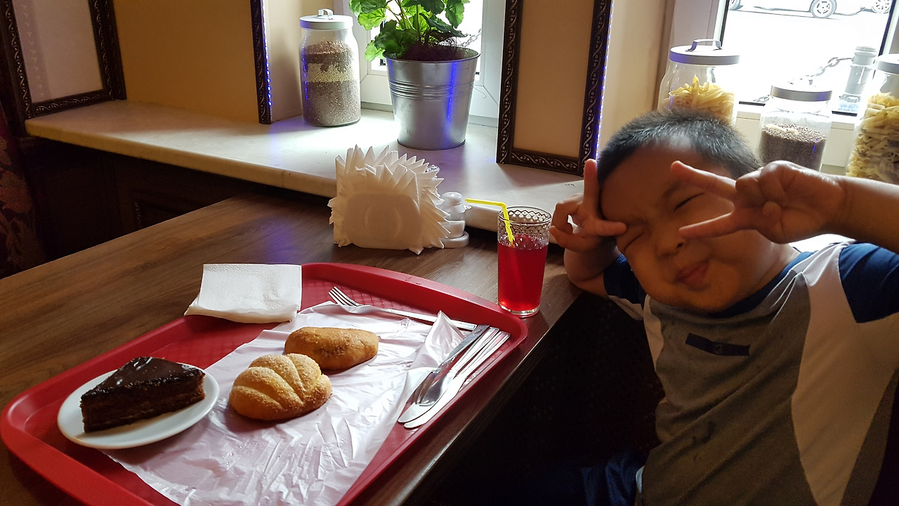 내려와서는 어제는 러시아 저녁을 즐겼으니 오늘은 북한 음식점을 가기로 했다. 어제 간 식당도 꽤 괜찮았지만 여러 식당을 다녀보자는 생각과 한국에는 없는 식당이라 북한 음식을 먹어보기로 했다. 식당으로 걸어가는 길의 경치가 예뻐서 사진 찍으니 아이가 엄마 보여주고 싶다고 자기도 사진 찍겠다고 하면서 찍었다. 이렇게 가족을 생각하는 마음이 생긴 나이가 되었다니 새삼 아이가 컸다는 것을 실감했다. 가는 길 중간에 공원 놀이터가 있어서 조금 놀았다. 이 도시에는 작은 공원, 놀이터가 정말 많았다. 러시아 아이들 틈에 껴서 다소 위험하면서도 신나게 놀다가 식당에 4시쯤 도착했는데 5시에 오픈한다고 해서 1시간을 밖에서 기다릴 수 없어 급히 검색을 해서 근처 카페를 가기로 했다. 어딘지 잘 모르는 곳이라 무작정 보이는 곳을 들어갔는데 완전히 현지인들이 간편하게 먹는 카페테리아 같은 곳을 들어갔다. 빵이 종류별로 있었고 그것을 본인이 골라 접시에 담고 마지막에 주스 같은 것은 주인에게 말해서 받는 방식이었다. 주인아저씨가 영어를 전혀 할 줄 몰라서 이때 통역 어플을 켜서 보여주고 말하고 하는 식으로 의사소통을 했다. 빵 2개, 조각 케이크 1개, 건포도 주스 1잔인데 다 합쳐서 4000원 정도였다. 아이는 빵과 케이크가 맛있다며 잘 먹었다. 5시가 되자 북한 식당으로 갔다.