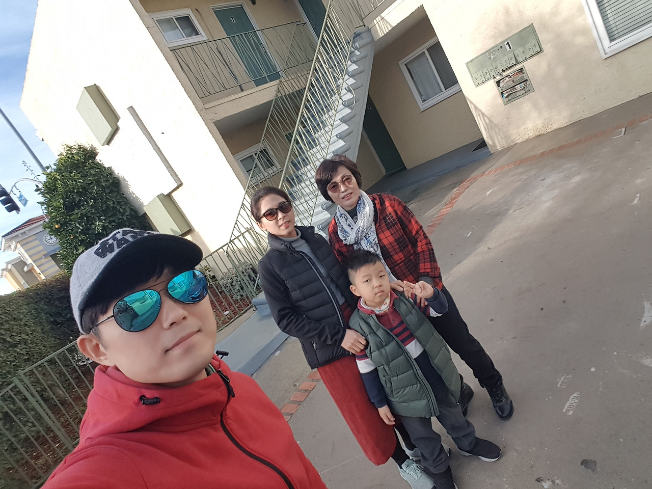 드넓은 서부를 가로지르는 로드 트립을 시작하는 날이다. 미국으로 여행 오기 전부터, 그보다 더 오래전부터 미국을 생각할 때 떠오르는 광활한 평원과 그곳을 가로지르는 고속도로와 그 위를 달리는 자동차들을 생각하면서 설렘과 막연한 두려움이 있었는데 드디어 내 손으로 운전을 하여 떠나는 날이었다. 그것을 아는지 개운하고 청명한 LA의 하늘이 우리를 반겼다. 드높은 야자나무와 낮은 건물들, 따뜻한 날씨가 있는 LA를 떠나는 날이다. 비좁고 조금 열악했지만 4일간 우리를 잘 보듬어준 숙소와도 작별이다. 아침에 일어나 다들 부리나케 아침 식사를 하고 짐 정리를 하고 나왔다. 남아 있던 식빵은 구워 라즈베리 잼과 땅콩 잼을 발라 토스트를 만들어 점심으로 먹기로 했다. 숙소에서 나와 주차장에서 숙소를 배경으로 마지막 사진을 찍어 남기는데 아이도 사진 찍고 싶다고 본인이 앵글을 잡아 이리저리 찍어보았다.