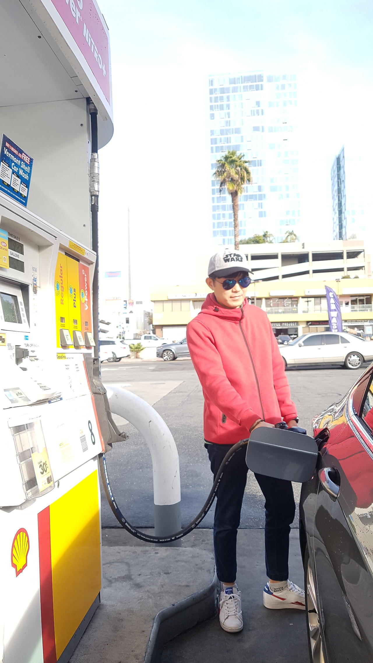 코리아 타운을 눈에 잠깐 담고 주유를 하러 갔다. 라스베이거스까지는 자동차로 5시간 정도 달려야 하기에 가득 찬 상태로 차를 달려야 했다. 물론 고속도로 중간에 휴게소가 있었지만 처음 달리는 긴 거리였기에 미리 준비를 하는 것이 나았다. 우리나라와는 다른 방식이어서 처음 해보는 주유에 긴장했다. 우리는 카드를 사용하지 않았기에 먼저 매점 역할을 하는 카운터 건물에 가서 우리가 주유할 주유기 번호를 말하고 돈을 낸 다음 와서 넣는 방식이었다. 주유기를 넣고 기름을 넣는데 긴장도 되고 기대도 되어서 아내에게 넣는 모습을 찍어달라고 부탁했다. 기름이 절반 정도 있는 차에 30달러 주유를 하는데 28달러가 넘어가니까 기름이 가득 차서 결국 밖으로 흘러나왔다. 멈추고 정산을 해서 얼마간 남은 차액은 돌려받았다. 한국보다 저렴한 미국 석유 물가를 느낄 수 있었다.