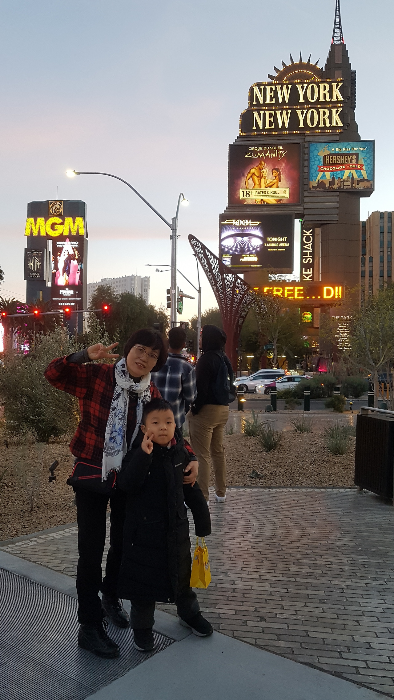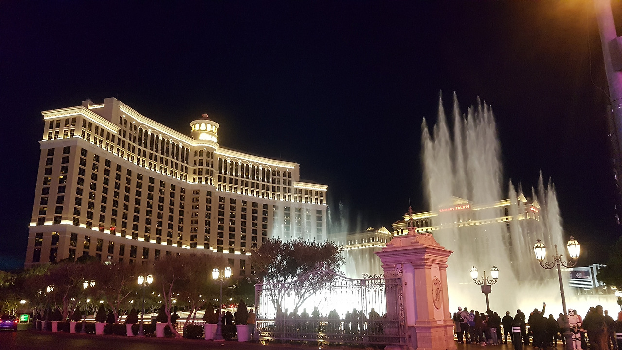 그리고 스트립을 걸으며 각종 호텔들의 거대한 위용을 느꼈다. 소비와 환락이 쌓아 올린 위용에서 미국의 또 다른 면을 보았다. 거리는 각지에서 온 들뜬 사람들로 가득했다. 겨울에도 이 정도면 여름에는 얼마나 많을지 상상이 안 갔다. 예전에 마카오를 갔을 때 날이 비 오고 안 좋아서 밖에서 못 즐겨서 아쉬웠는데 이곳은 걸어가기에 부담이 없었다. 날이 어두워 지자 우리는 꼭 봐야 한다는 무료 쇼 중에서 손꼽히는 벨라지오 호텔 분수 쇼를 한 곡 감상했다. 잔잔한 음악에 어우러져 높이까지 솟구치는 분수가 인상적이다. 호텔 안에 들어가 초콜릿 분수, 정원도 구경하고 아이가 먹고 싶어 하는 초콜릿 아이스크림도 사 먹었다. 그리고 또 하나의 무료 쇼인 미라지호텔 화산쇼도 30분을 기다려 구경했다. 규모는 작았지만 뜨거운 열기가 가득한 불꽃에 다들 넋 놓고 보았다.