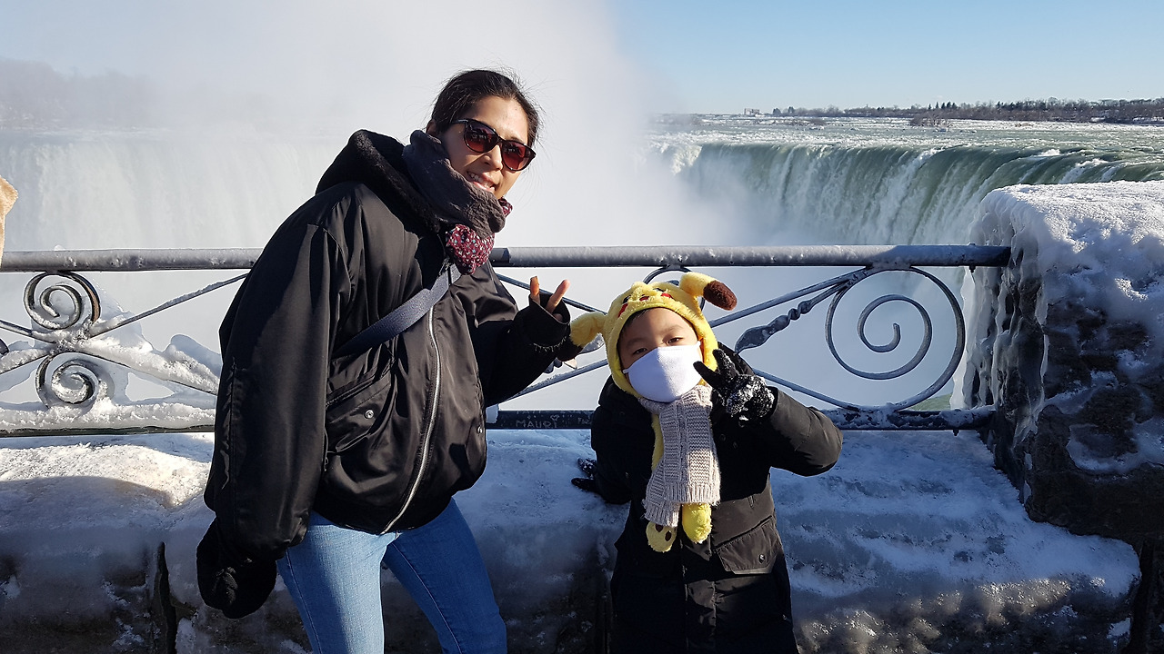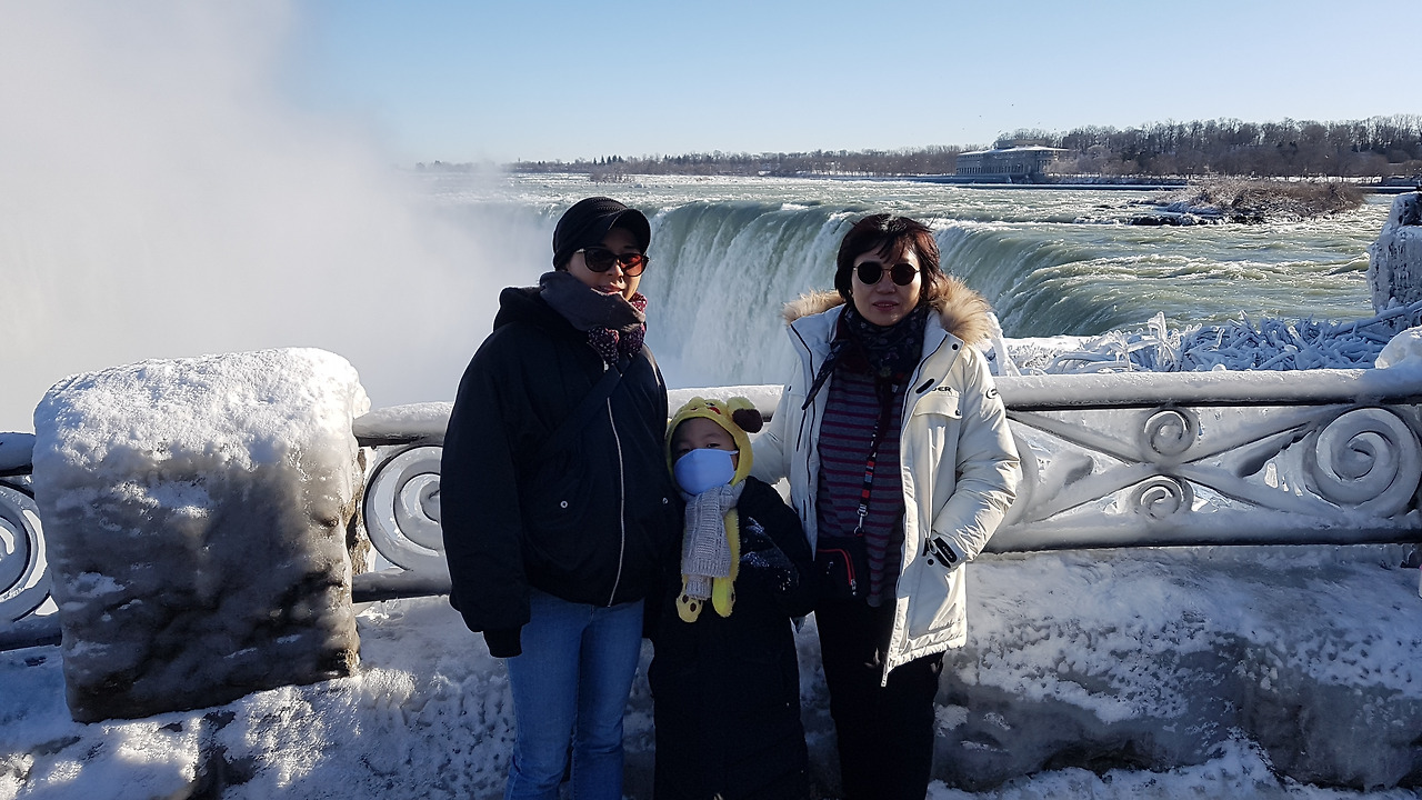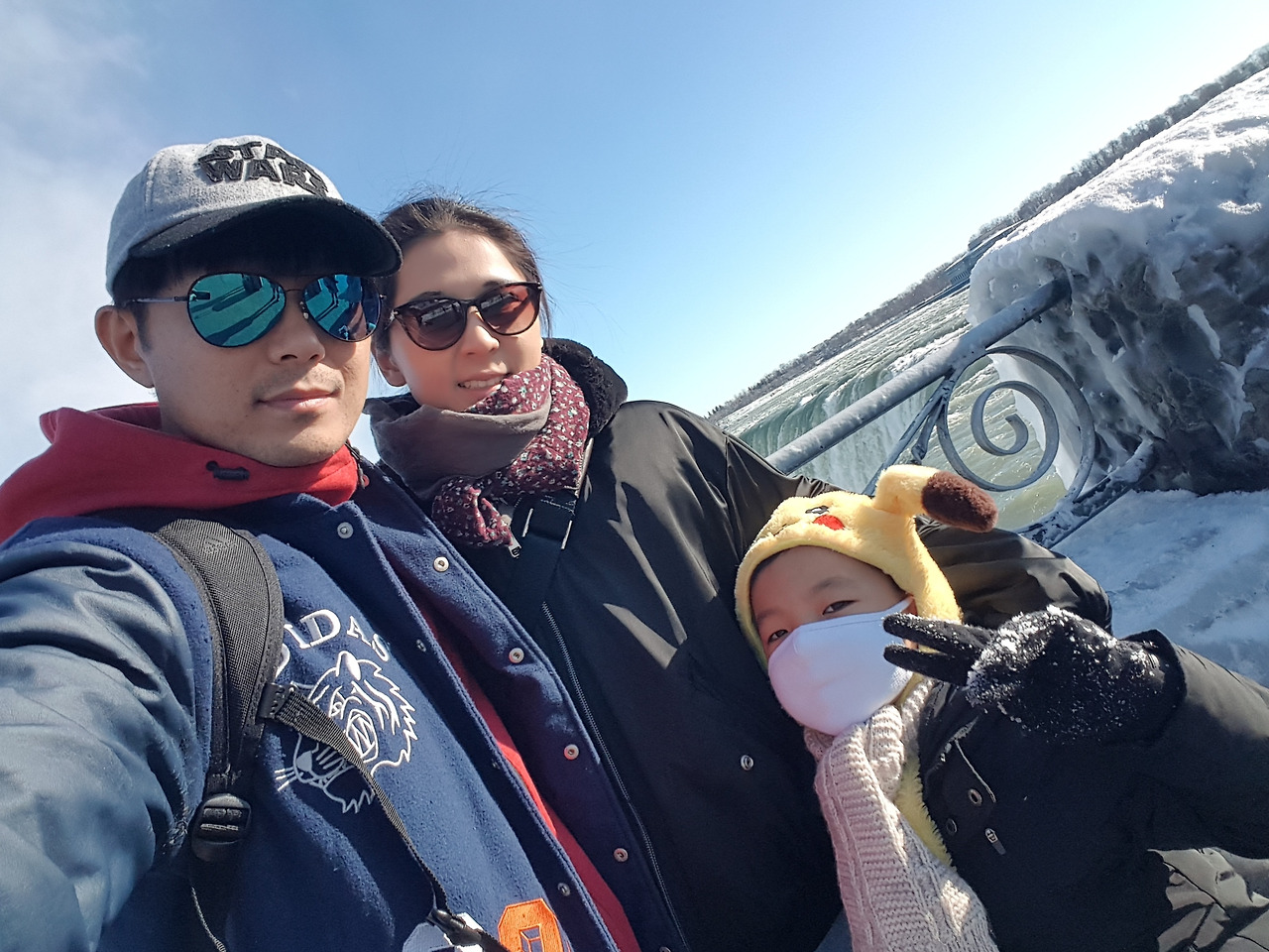 아침 7시 알람이 울리자 모두 약속이나 한 듯 벌떡벌떡 일어났다. 짐을 싸고 토론토의 추위에 맞춰 옷을 겹겹이 입고 영 던다스 스퀘어로 향했다. 오늘은 영하 13도까지 떨어지는 날씨라서 아내는 윗옷을 5겹이나 입었다. 어제 추위에 벌써 적응했는지 생각보다 날이 춥지는 않았다. 밖은 출근 시간이라 그런지 많은 토론토 사람들이 저마다의 일터를 향해서 부지런히 걸음을 옮기고 있었다. 우리도 호텔에서 가까운 버스터미널까지 부지런히 발을 놀려 한 손에는 캐리어, 한 손에는 아이 손을 잡고 열심히 걸었다. 인파에 휩쓸리지 않도록 긴장하면서 걷다 보니 생각보다 일찍 도착했다. 터미널 안에는 죄다 관광객으로 보이는 옷차림을 한 사람들이 있었다. 나이아가라 폭포로 가는 버스에 설레는 마음으로 올랐다. 미리 예약을 해서 타는 버스인데 일찍 예약할수록 가격이 저렴해 상대적으로 싼 가격에 예매를 한 버스였다. 하루밖에 안 있었지만 눈에 익었던 토론토 시내를 지나서 두 시간을 달려가는 도중 바다처럼 넓은 온타리오 호수를 볼 수 있었다. 온타리오 호수는 미국과 캐나다의 국경이기도 한데 북미의 거대한 호수인 5대호 중의 하나여서 정말 처음 봤을 때에는 바다인 줄 알았다. 가는 길에 보이는 캐나다의 마을과 집들이 한적하고 한가롭게 느껴져서 겨울 왕국의 풍경을 떠올리게 했다.