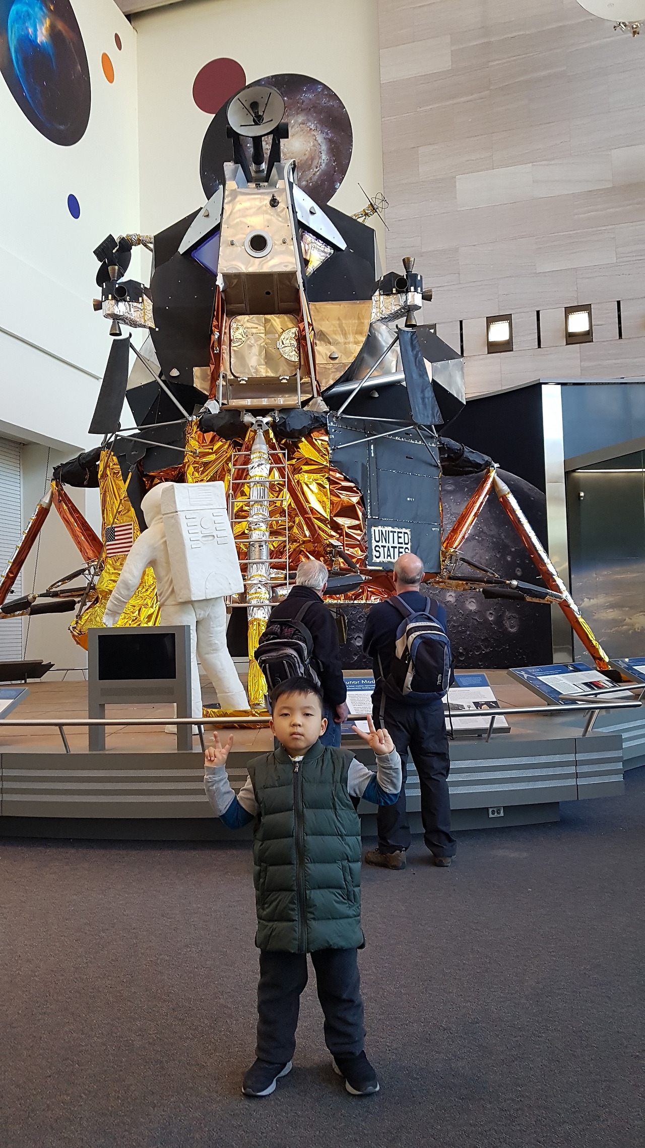 식사를 마치고 난 다음 그다음 코스인 아내와 아이가 기대하던 맞은편에 있는 항공우주박물관에 갔다. 이제 아이에게 지도 받아오기와 화장실 묻기는 식은 죽 먹기였다. "Can I get a map?" 한 다음 직원이 무슨 말 쓰니? 하면 "Korean!"이라고 하고 "How many?" 하면 "Four!" 해서 직원이 하는 질문까지 받을 줄 알았다. 아내는 멀리서 보는 그 모습에 아주 대견해했다. 처음 들어왔을 때 펼쳐진 우주선과 그 전경에 감탄했는데 박물관이 공사 중이라 절반밖에 전시를 하지 않아 다소 아쉬웠다. 말 그대로 항공우주박물관 중에서 항공 분야는 리모델링 중인 듯했다. 그래도 각종 우주선, 우주복, 장비, 우주에 대한 설명을 보면서 돌아보았다. 아이는 체험 코너를 다 돌고 우주 비행선들을 관심 있게 봤다. 이곳은 그래도 만들어진 지 오래되어서 그런지 규모는 굉장하고 전시품목도 훌륭했지만 체험하는 쪽은 내가 사는 도시의 체험관이 더 좋아 보였다.