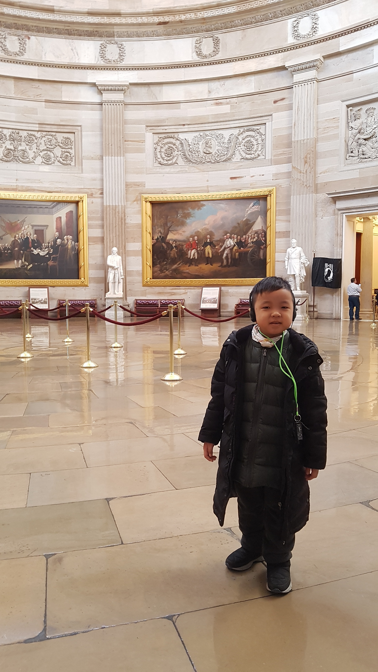 아이가 어젯밤 10시에 잠들더니 아침 6시에 홀로 일어나서 화장실 가서 오줌 싸고 놀잇감 달라고 어머니를 귀찮게 했다고 부스스 일어난 나에게 말했다. 나머지 식구들은 아침 7시에 일어나 조식을 먹었다. 아침에 먹다가 남은 커피를 싸들고 호텔을 나섰다. 예약된 투어시간에 맞춰 국회의사당을 향해 걸었다. 화창한 날씨 속에서 인도 위에는 출근하는 사람들, 차도 위에는 저마다 목적지를 향해 가는 자동차들로 붐볐다. 조금 걸어가자 저 멀리 할리우드 블록버스터 영화에 단골로 등장하는 백악관과 함께 쌍벽을 이루는 국회의사당의 하얀 돔이 보였다. 실제로 가까이 가서 보니 매끄러운 백색 건물이 고풍스러우면서 위압감을 가져다주었다. 밑에 있는 방문객 센터로 가서 들어가려는데 입장 규정이 까다로웠다. 모든 음식과 심지어 물까지도 없애야 했다. 박물관 들어갈 때 물은 허용이 되었는데 그래서 결국에는 아이 간식으로 가져갔던 사탕과 쿠키 과자는 먹지 못하니 쓰레기통에 버리고 열지도 않은 1리터짜리 큰 생수 한 통을 가족이 나눠서 모조리 마셔야 했다. 그 때문에 시간도 지체되어 여유 있게 왔다고 생각했지만 겨우 오픈 시간에 도착했다. 국회의사당은 캐피톨(Capitol)이라고 부르는데 로마의 7개 언덕 중 카피톨리누스 언덕에서 이름을 따왔다.