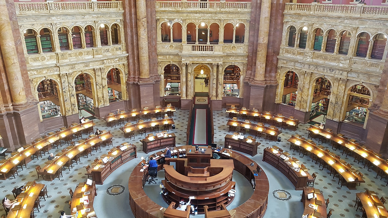 투어가 시작되어 단체 극장에 모여 'E pluribis unim'이라는 영상을 보고 일일이 헤드폰을 받은 뒤 가이드를 따라가기 시작했다. 물론 설명이 영어라서 나는 잘 알아듣지도 못했다. 그런데 아까 입장 전에 마신 물 때문에 모두 화장실이 급해서 화장실로 달려갔다. 화장실을 갔다 오니 다른 가이드가 먼저 간 가이드가 있는 곳으로 안내를 해주었는데 그전에 화장실을 다녀왔다고 헤드폰을 물티슈로 닦아 주었다. 뒤늦게 투어에 합류하여 로툰다, 원형 중심에 이르렀다. 거대한 원형광장에는 미국의 독립 영웅이자 초대 대통령인 조지 워싱턴과 미국 초기 역사들이 주제로 한 벽화들이 걸려 있었고 위에는 천장화가 있었다. 왕국이었던 시절이 없는 미국이지만 워싱턴을 신격화해서 표현한 것이 특이했다. 어쩌면 짧은 역사를 가진 그들에게 있어 워싱턴의 존재는 제우스에 비견되나 보다. 사진을 찍고 옛 상원 회의실과 하원 회의실, 50개의 동상을 구경하고 투어를 마쳤다. 그리고 연결된 지하통로로 국회 도서관인 토머스 제퍼슨 빌딩으로 넘어갔다. 고풍스러운 국회 도서관을 내려다보고 거리로 나셨다.