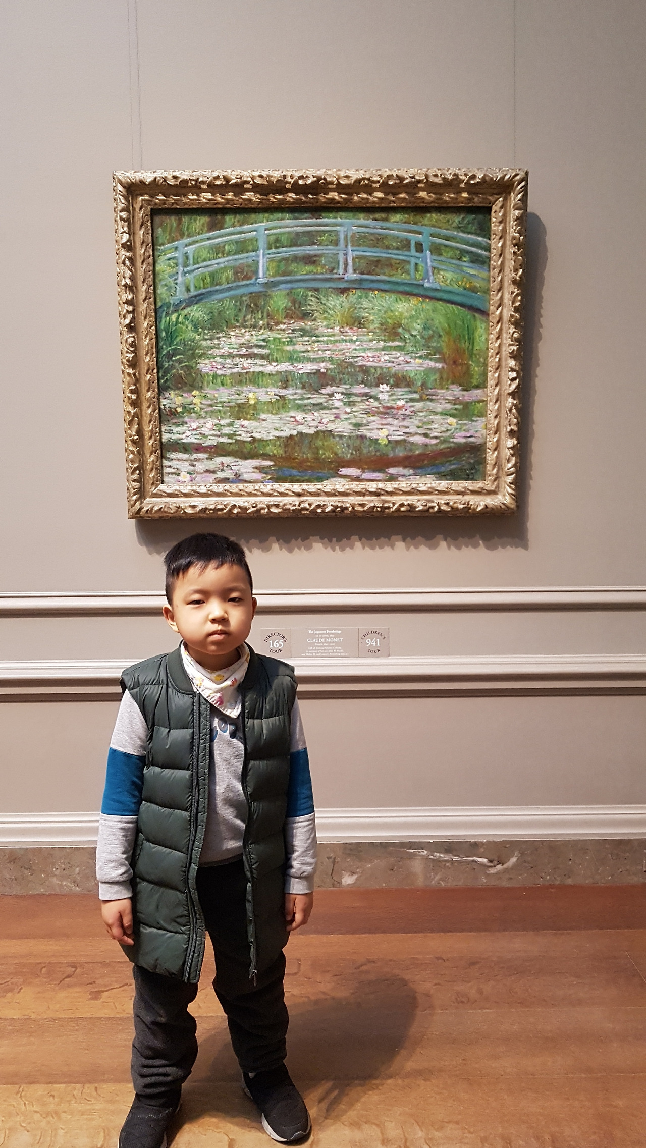 워싱턴의 박물관들 중 개인적으로 가장 기대가 많았던 내셔널 갤러리에 도착하여 둘러보았다. 국립 미술관인 내셔널 갤러리는 본래 국가에서 처음부터 만든 것은 아니고 재무부 장관을 역임했던 멜렌이 기증하여 그를 토대로 1941년에 문을 열어 총 3만 점이 넘는 작품을 소장하고 있다고 했다. 두 개의 건물이 있는데 서관은 고전 미술 위주이고 동관은 현대 미술 전시라서 우리는 바로 서관으로 이동했다. 역시 어머니와 아내, 아이는 셋이 같이 다니고 나는 제일 길게 집중해서 감상했다. 중세미술부터 르네상스, 인상파 등 유럽 예술가들의 그림을 보고 있자니 런던과 파리의 미술관들이 떠올랐다. 자국 작가들의 그림도 있지만 이러한 퀄리티 있는 작품을 스스럼없이 전시하며 무료로 전시하는 수준에 대해 놀라울 뿐이었다. 아내와 어머니는 소파에 아이를 두고 번갈아가며 쭉 미술관 스캔을 했다. 내가 보고 왔을 때 아이와 어머니는 한글 읽기, 숫자 퀴즈를 내면서 기다리고 있었다. 나가기 전에 그림에 전혀 관심 없는 아이를 데리고 제일 유명한 고흐, 고갱, 르누아르, 모네 등의 작품 아래서 사진을 찍어줬다. 나중에 미술시간에 그림을 마주치면 아마 알아차릴 거라는 기대감과 함께 사진으로 남겼다. 다소 늦은 점심은 지하 푸드코트에서 먹었다. 그릇에 음식을 담고 무게를 달아 가격을 내는 건데 괜찮은 가격으로 먹을만했다.