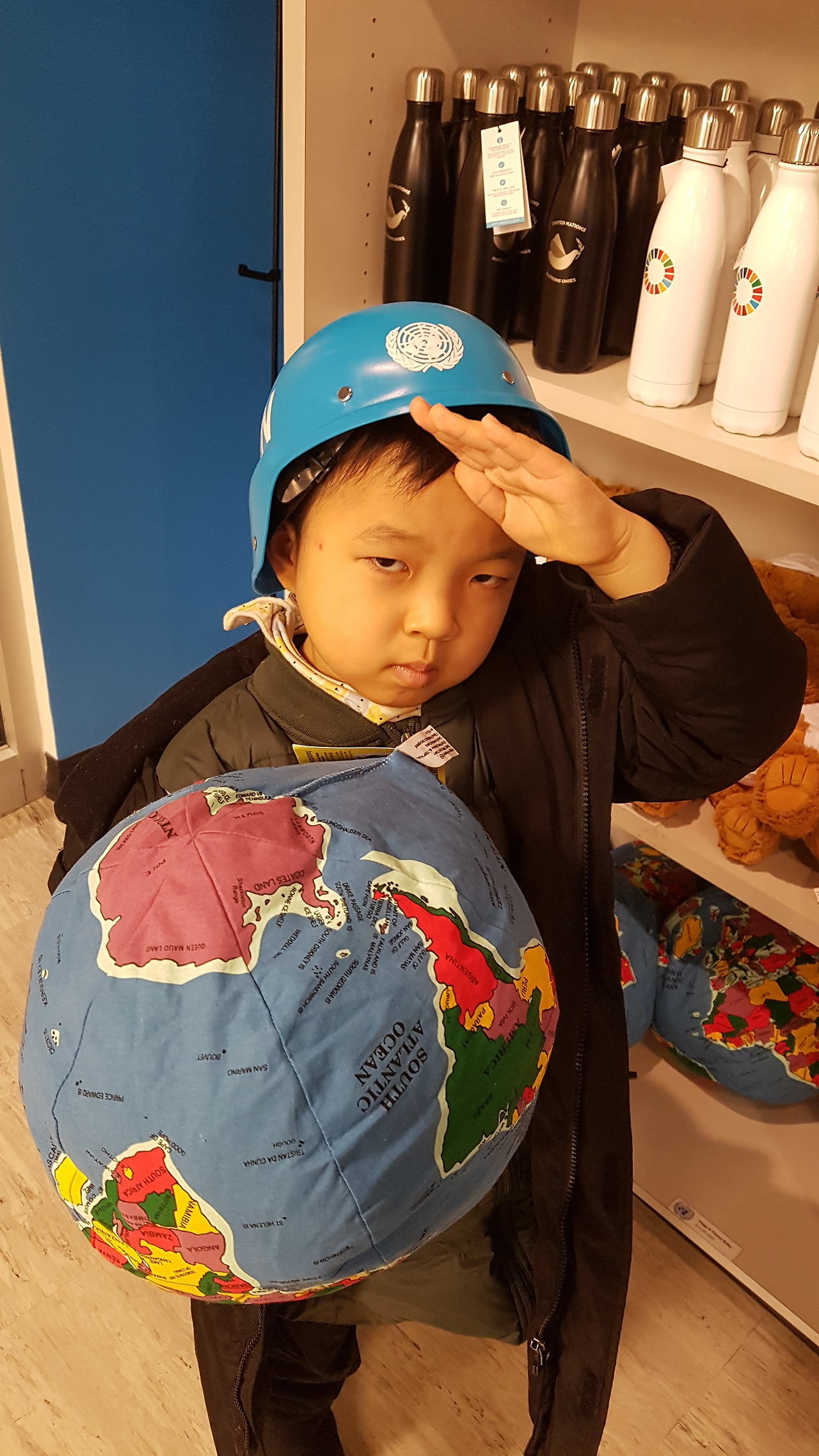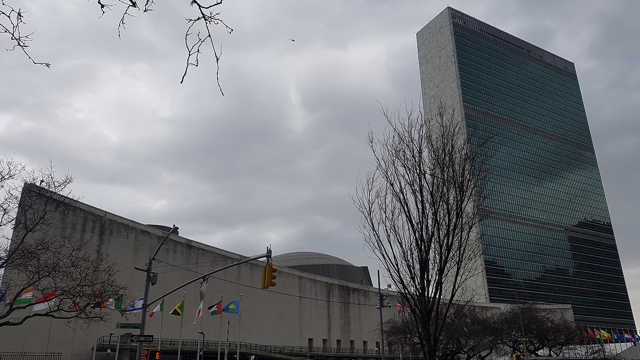 흐리고 추운 날씨를 뚫고 UN본부까지 걸어갔다. 아이가 어려서 원래 계획에 없다가 근처라서 가깝기도 하고 언제 와보나 싶어서 시간이 남은 김에 가보기로 했다. 언제나 교과서에 빠지지 않고 등장하는 그 건물이 눈 앞에 보였다. 세계 평화를 이루기 위한 장소답게 미래 세계를 선도할 각국에서 온 견학생 무리와 전 세계에서 온 방문객들로 와글와글했다. 아내는 방문자 대표 등록하고 사진 출입증도 찍어서 우리 가족을 위한 입장 준비를 마쳤다. 우리는 보안검색을 철저히 받고 나서 방문자 센터 안으로 들어갈 수 있었다. 아이가 너무 어려서 들어도 무슨 말인지 모르기에 투어를 신청하지 않아서 회의장 안까지는 볼 수 없었다. 로비와 지하만 둘러보고 나왔다. 벽면에 반기문 사무총장 사진도 있어서 아이와 함께 찍었다. 아내는 하버드에서 타이거 마미, 나는 UN에서 타이거 대디였다. 이 와중에 아이는 장난감 생각만 한다.