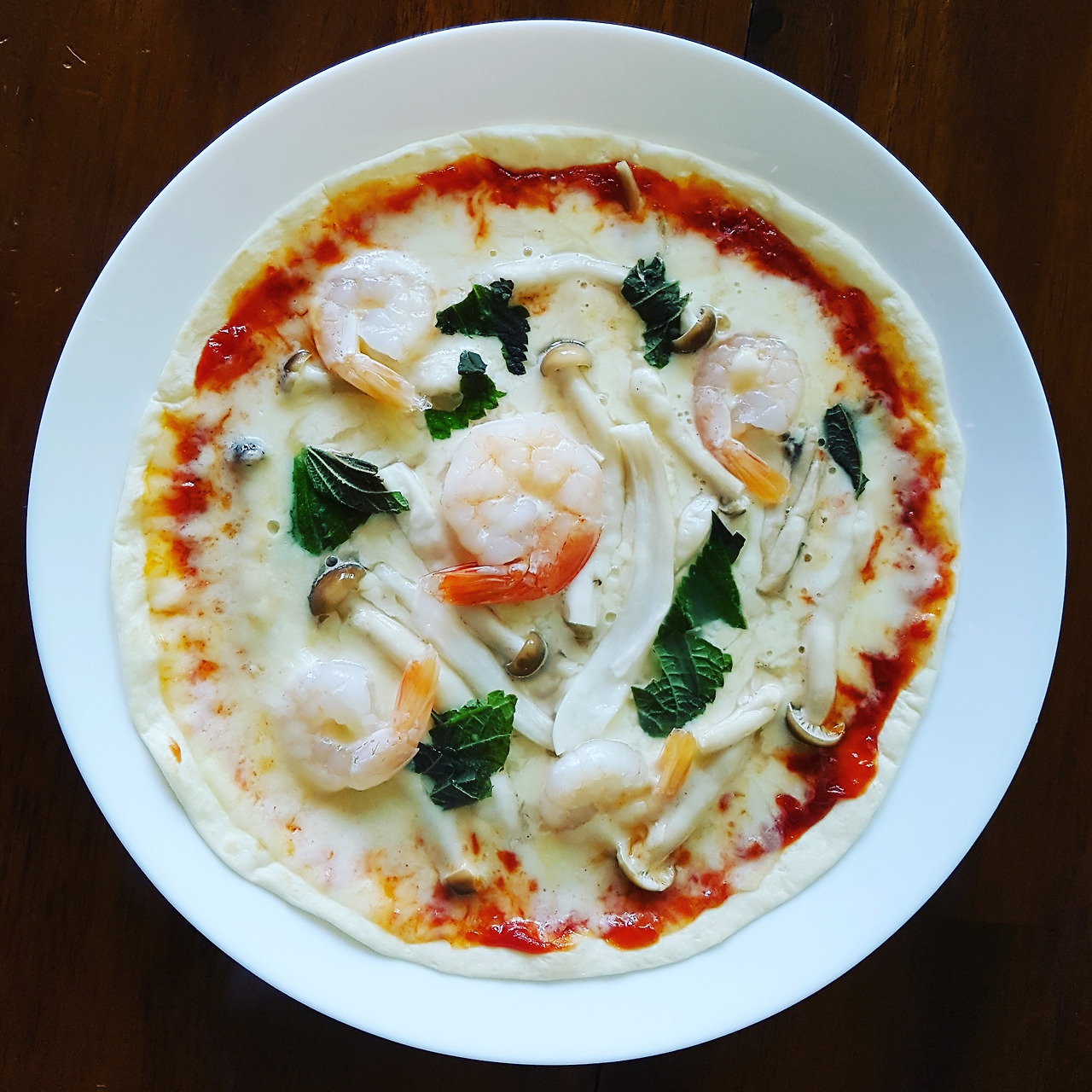 6. 피자 도우 위에 토마토소스를 바른다.