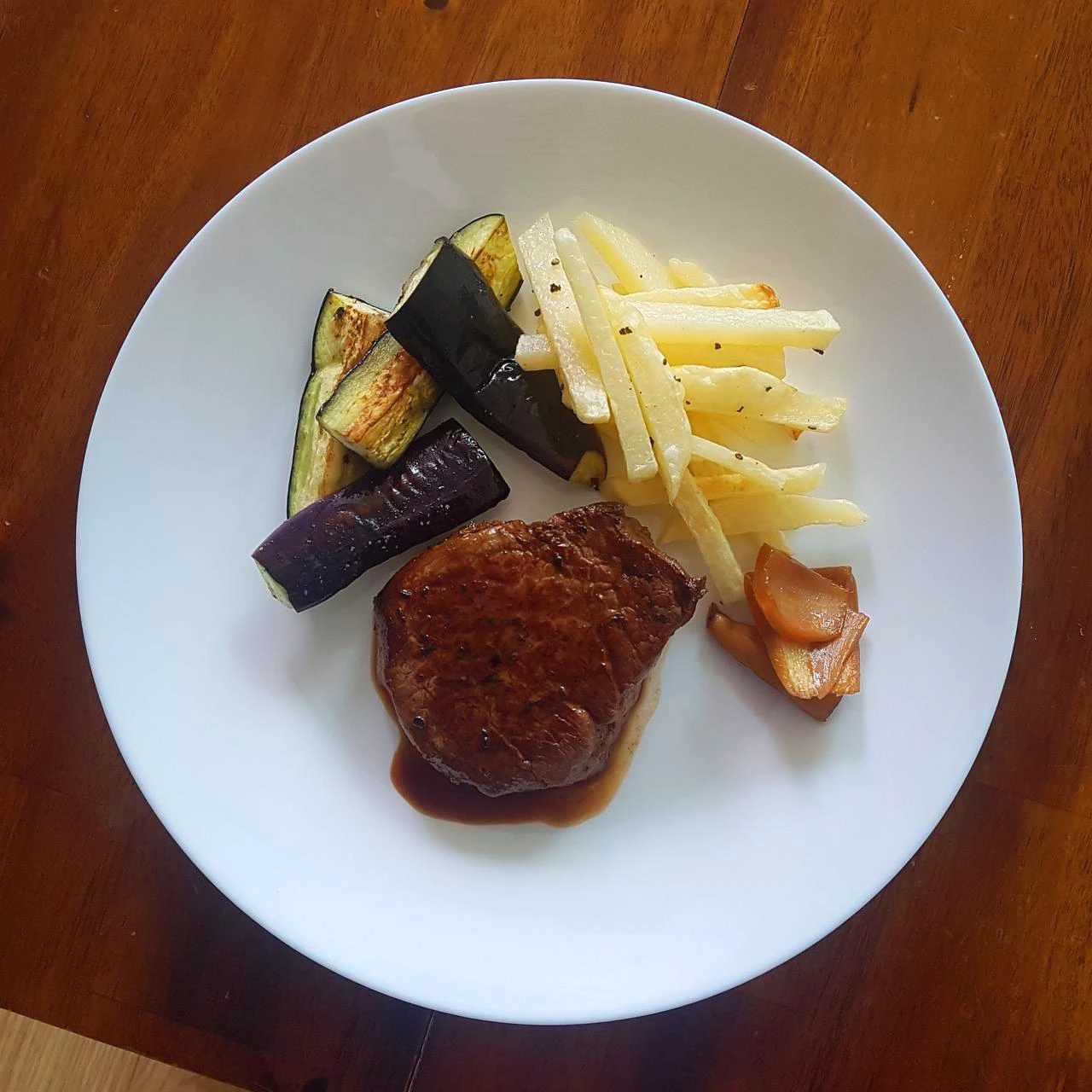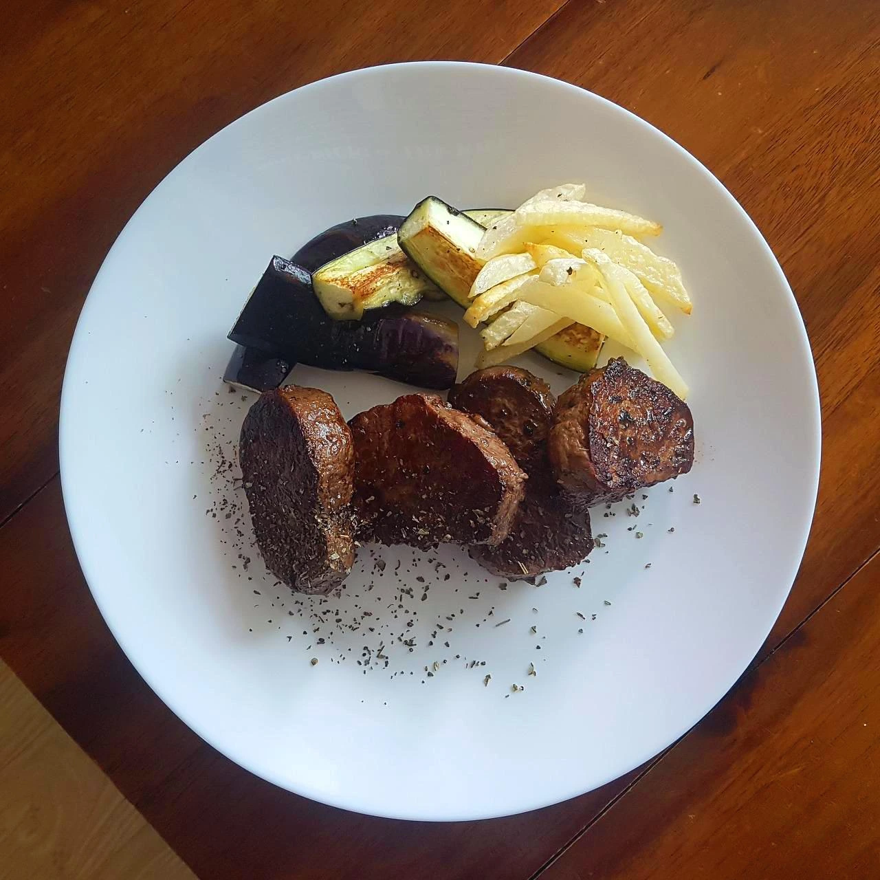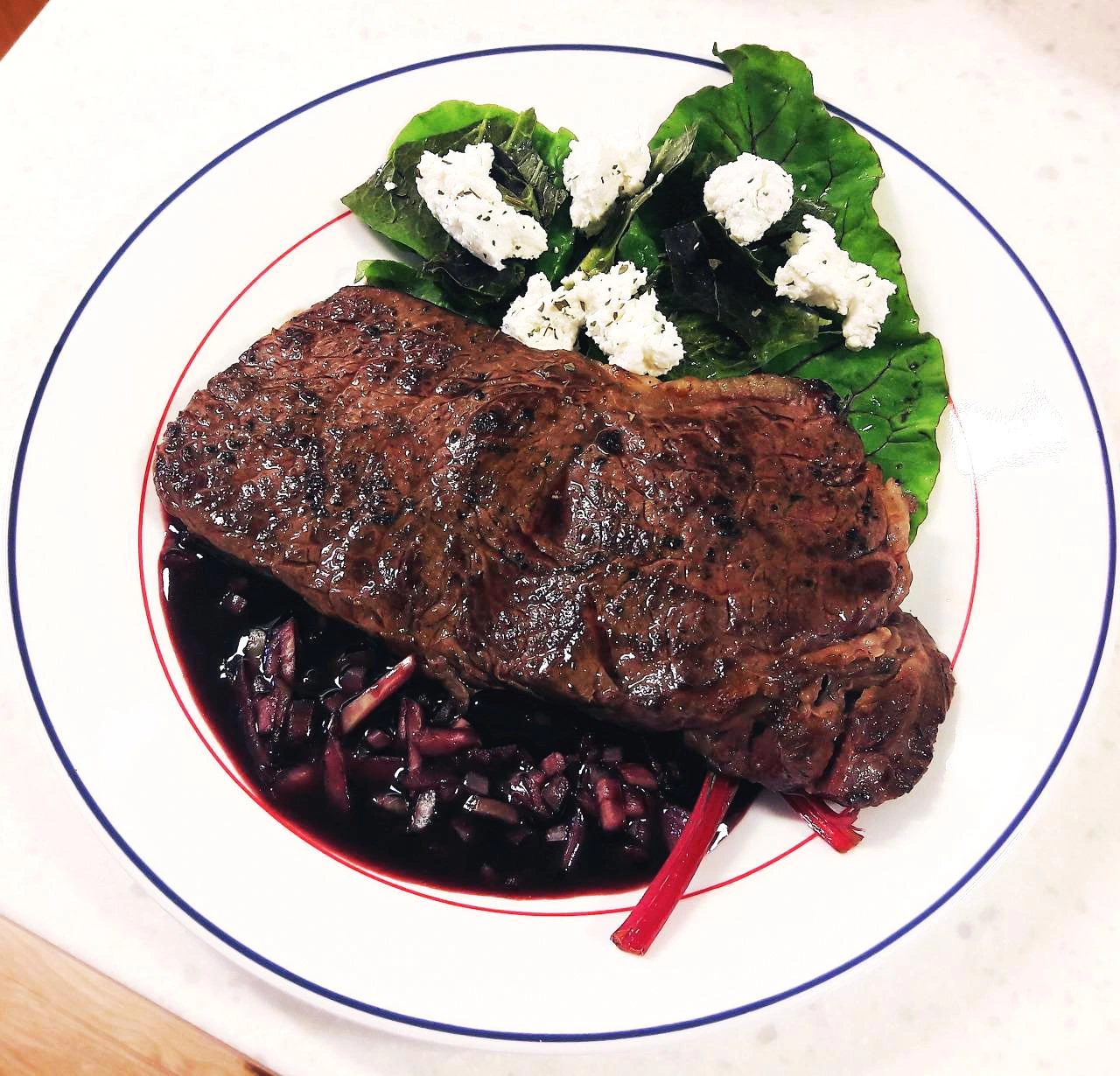 스테이크 소고기, 버터, 오일, 허브(로즈메리, 바질 등), 소금, 후추, 가니시 재료