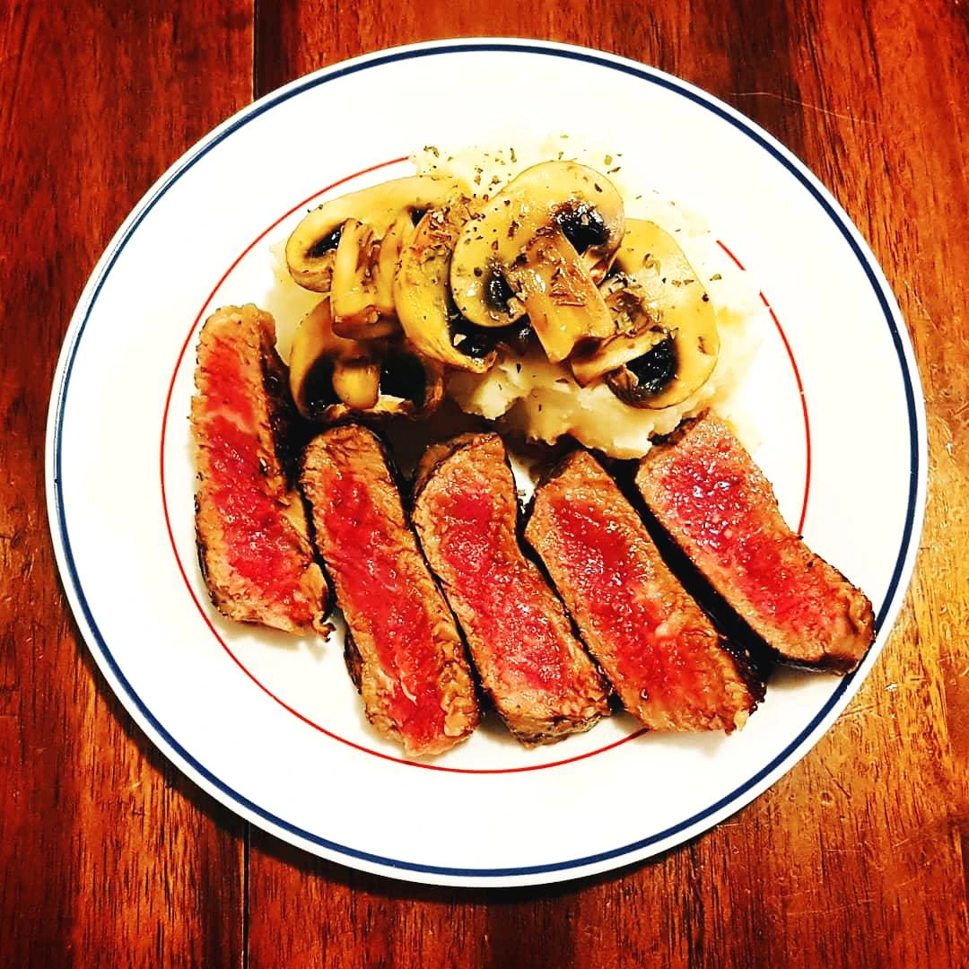 마당이 있는 집이 아니라면 집에서 스테이크를 할 때는 팬을 가지고 할 수밖에 없다. 숯불로 직화구이를 하는 것은 야외에서나 가능한 것이라 가정에서 대개 고기를 굽는다면 팬으로 하는데 일단 고기 구울 팬을 최대한 달군다. 그리고 고기를 올리는데 고기는 미리 시즈닝을 해놓는 것이 좋다. 소금, 후추, 허브로 밑간을 한 다음 오일을 바르고 고기를 굽는데 센 불에 겉면을 익히고 불 조절을 해서 안까지 익히는 방식으로 한다. 그리고 버터를 넣고 팬에 있는 기름을 고기에 끼얹는 방식으로 구워가는데 이때 포도주를 넣어 맛을 더하기도 한다. 고기 겉면이 마이야르 반응(maillard reaction)이라고 갈색을 띠면서 풍미가 극대화되는 화학반응이 일어나게 한다. 굽기에 따라서 스테이크를 나눌 수 있는데, 겉에만 익히고 속은 핏기가 살아있는 것을 레어(rare), 안에 붉은 기가 도는 것을 미디엄(medium), 완전히 익힌 것을 웰던(welldone)이라고 한다. 그리고 그 사이 등급을 또 나눈다. 고기를 굽고 난 다음 레스팅 과정을 거치면 더욱 맛있게 먹을 수 있다. 레스팅은 고기를 식히는 것으로 5분 정도 종이 포일로 싸주면 뭉쳐있던 고기 근육이 풀어지면서 육즙이 전체적으로 잘 밸 수 있기 때문에 조금 기다림이 있더라도 해주면 좋다. 버섯, 호박 등 취향에 맞는 가니시와 함께 접시에 잘 담아내고 먹으면 육즙이 가득 입안에 감칠맛이 돌 것이다.