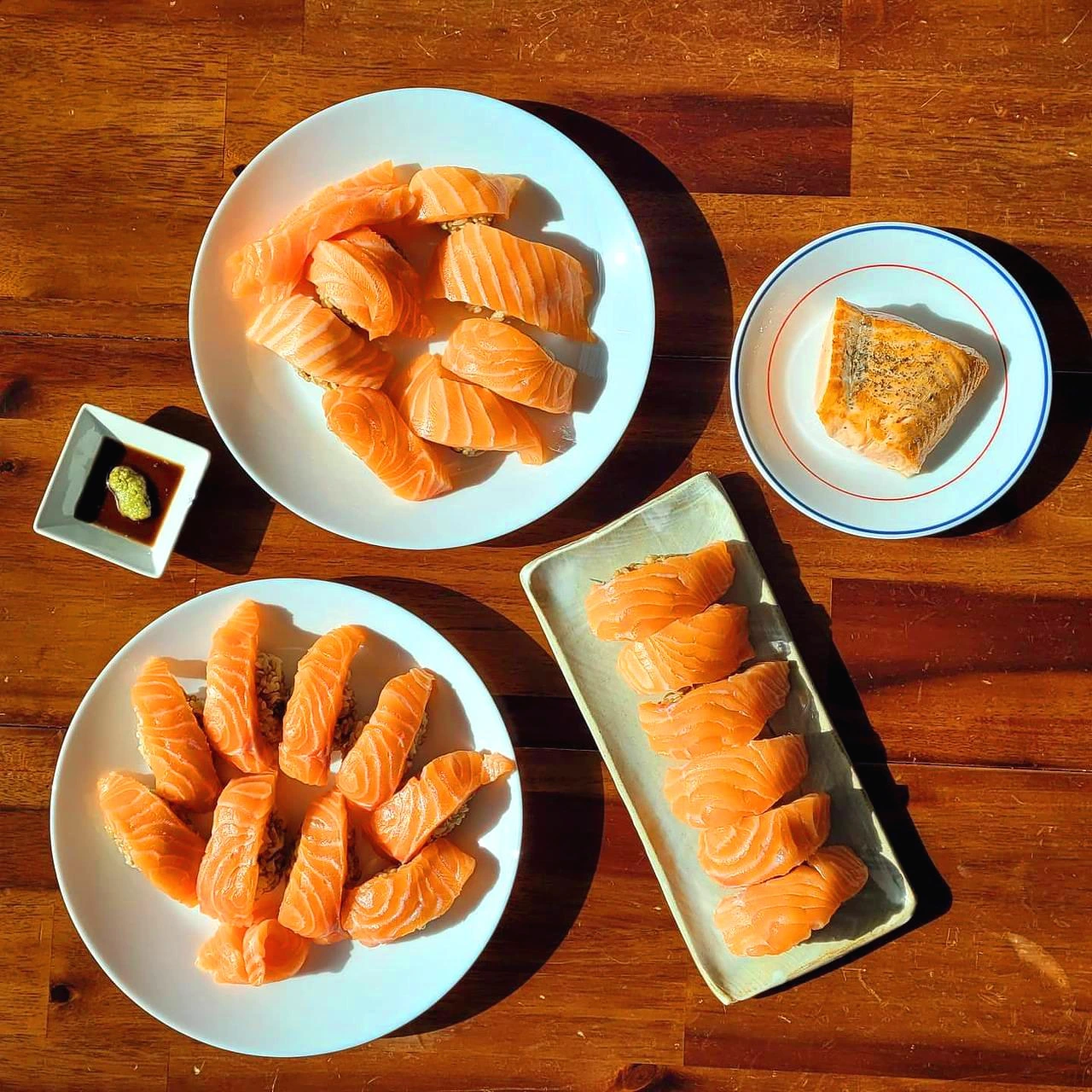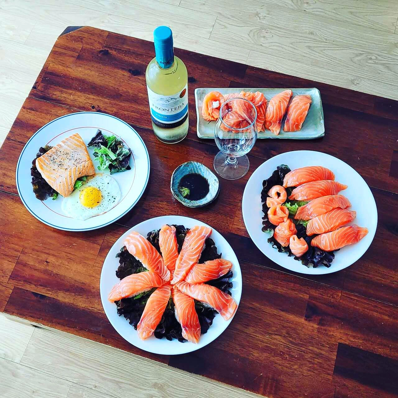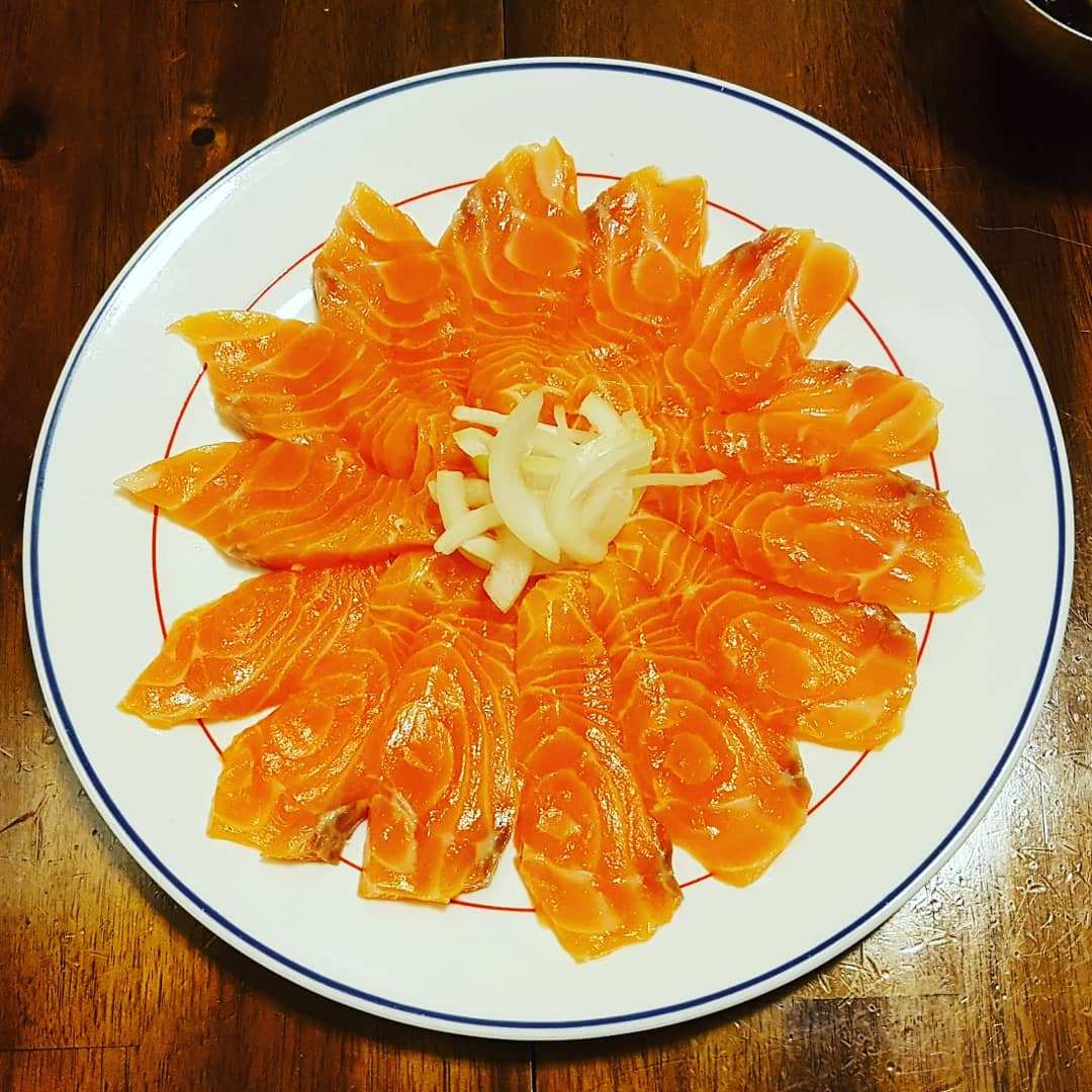 사시미는 마트에서 구할 수 있는 횟감용 생선을 구입하여 집에서 사시미 칼로 썰어서 먹어도 되고, 배달로 신선한 횟감을 얻어 사용할 수도 있다. 나는 생선 중에서 연어(사케(さけ), 鮭)를 제일 좋아해서 마트에서 횟감용 연어를 자주 애용했다. 연어의 뱃살 부분을 사서 아내에게 생일 선물로 받은 사시미 칼을 이용해 자주 먹었다. 회 뜨는 법을 배운 것은 아니지만 회칼을 사용해서 나름 최대한 일정한 두께로 썰어 담았다. 사시미 그대로 내기도 하고 식초, 설탕으로 간한 밥에 사시미를 올려 스시를 만들기도 하고 그릇에 담아 사시미동을 만들어 먹기도 했다. 간장에 와사비를 섞어서 사시미를 찍어 먹고, 락쿄나 초생강(베니쇼가, 紅生姜)으로 입가심을 하고 술 한 잔을 계속 반복하면 어느새 입 안에는 춤추는 바다가 한가득이다.