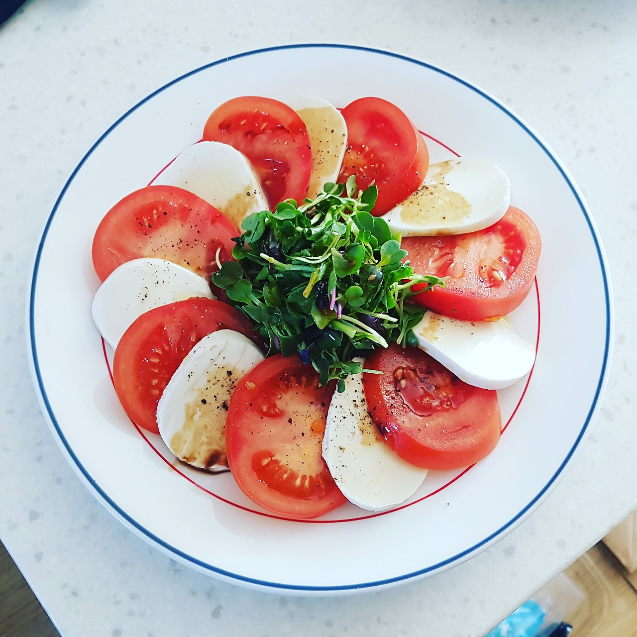 생 모짜렐라 치즈, 바질, 토마토, 올리브 오일, 소금, 후추, 발사믹 식초