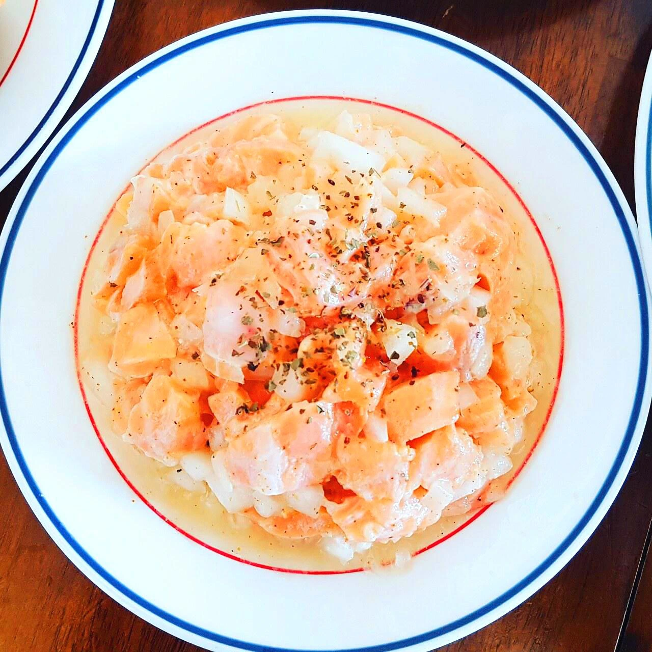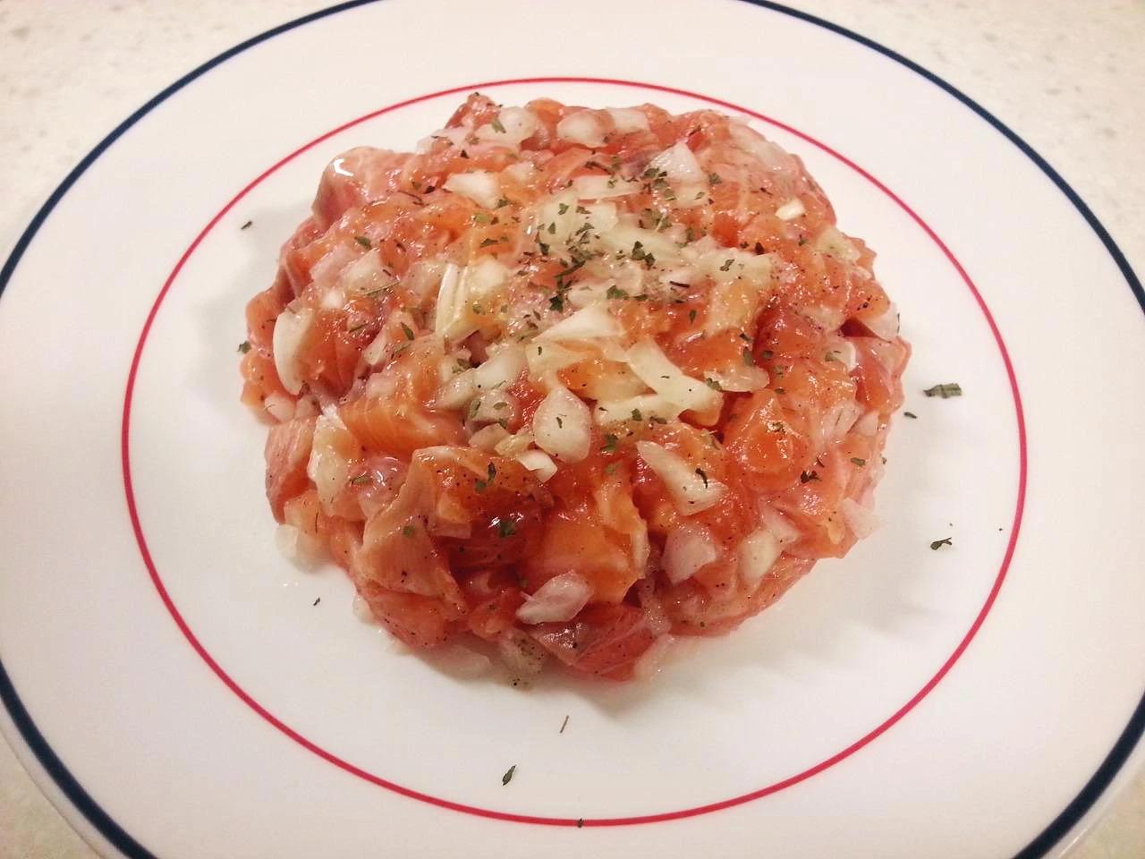 생 연어를 먼저 흐르는 물에 가볍게 씻고 먹기 좋게 작은 사이즈로 썰어준다. 완전히 갈듯이 다진다는 느낌까지는 아니지만 적당히 작게 잘라서 식감은 살리는 편이 좋다. 채소로는 유럽에서 사용되는 작은 양파인 샬롯을 쓰지만 없다면 적양파, 양파를 사용해도 무방하다. 양파와 실파 등을 잘게 자르고 바질 등 허브를 추가해서 준비하면 된다. 잘게 썬 연어와 다진 양파, 허브 등에 레몬에서 즙을 내어 섞는다. 그리고 올리브 오일, 소금, 후추로 맛을 내어 연어의 고소함이 살아있게 한다. 원형 틀에 넣고 냉장고에 2시간 정도 넣어둬서 차갑게 한 후 먹는다.