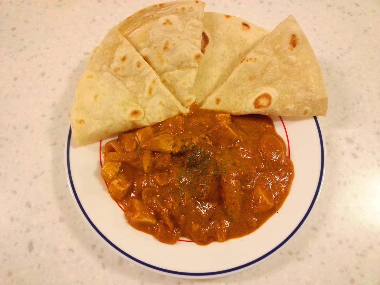 그릇에 담고 만들어 놓은 난이나 쌀밥과 함께 먹으면 된다. 난은 밀가루 반죽에 이스트, 설탕, 소금만 넣고 팬에 구워내는 간단한 요리이다. 난까지 만들기 귀찮다면 담백한 토르띠야나 빵으로 대체해도 무방하다. 쌀밥과 함께 먹어도 매우 좋은 요리이다. 나는 나름 분위기 내기 위해 토르띠야를 활용해 커리와 함께 한 끼를 만들어보았다.