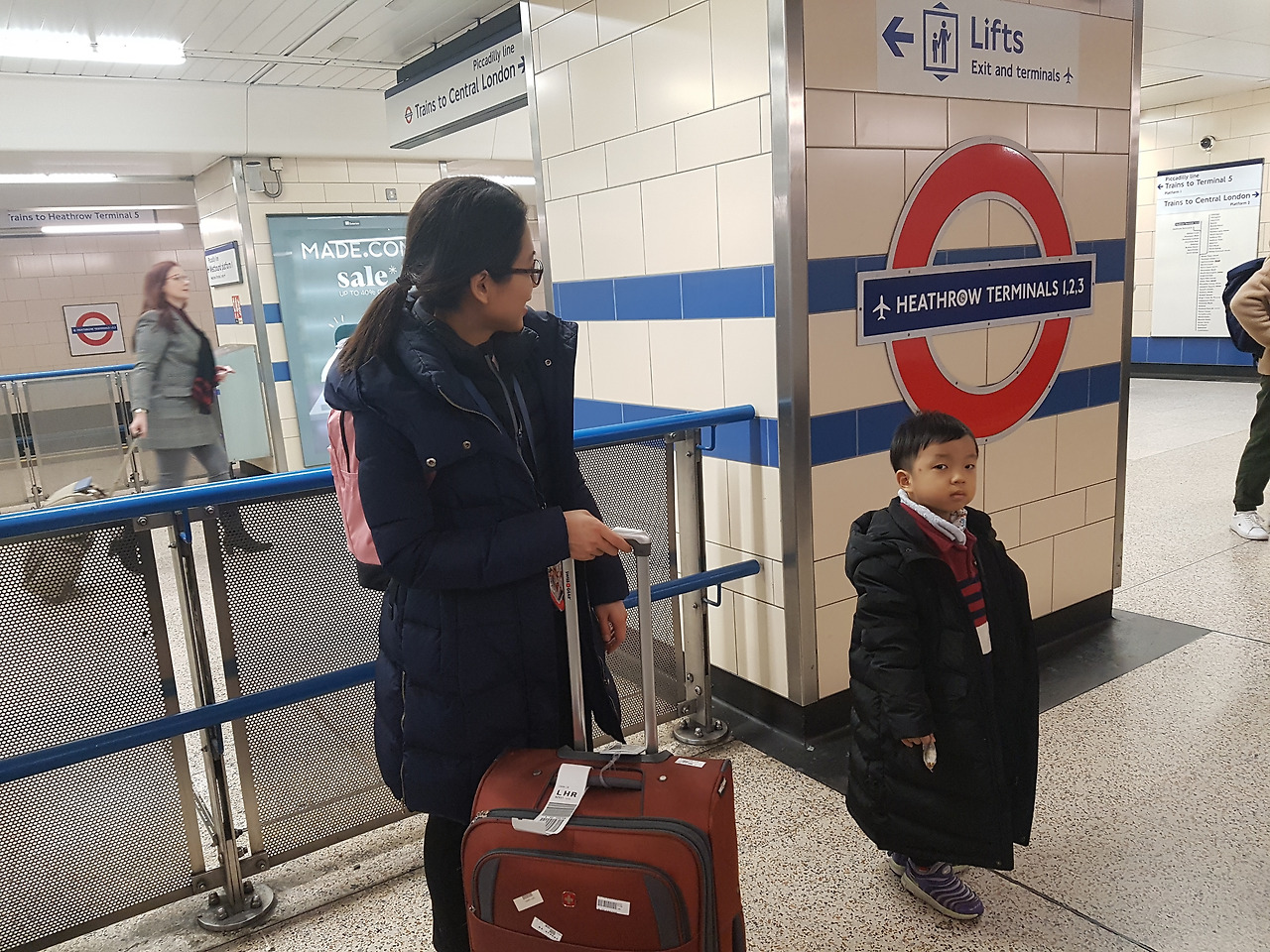 지하철 기다리는 중영국에서는 입국할 때 까다롭다는 말이 들어서 살짝 긴장했는데 가족끼리 와서 그런지 입국심사도 정말 간단하게 끝나고 지하철 카드도 만들어서 금방 탔다. 런던 지하철은 1863년에 운행을 시작한 세계 최초의 지하철이다. 영국에서는 지하철을 말할 때 언더그라운드(Underground) 혹은 튜브(Tube)라고 하는데 언더그라운드가 정식 명칭이고 튜브는 둥근 튜브처럼 생긴 모양 때문에 붙여진 별명이다. 다른 나라에서는 다들 서브웨이(Subway)나 메트로(Metro)라고 부르니 원조의 이름을 부르지 않는 것도 색다르다. 튜브라는 말이 걸맞게 지하철 내부는 둥근 모양으로 우리나라 지하철보다 좁아 보였다. 그래도 그 시간에는 타는 사람이 몇 없었는지 자리는 여유 있어서 편히 앉아갈 수 있었다. 작지만 그래도 앉아 갔던 지하철에서 1시간 동안 달려 호텔로 이동했다. 한국 시간으로는 이미 아침 7시가 돼가고 있었다. 다들 뜬 눈으로 밤을 새운 격이라 조금 예민했지만 어서 역에 도착해 내리길 기다렸다. 역에서 내려 지상으로 올라오니 차가운 밤공기가 확 느껴졌다. 진짜 런던의 밤거리에 우리가 서 있는 것이다. 좁은 2차선 도로변에서 공기를 마셔보았다. 그리고 호텔을 향해 걸어갔는데 가는 길에 마트에서 물과 먹을거리를 사기로 했다. 간단하게 장을 보고 호텔에서 체크인을 했다. 그리고 방에 들어갔는데 나와 아내는 오 마이 갓을 외쳤다. 방이 반지하에 고시원처럼 침대, 샤워실, 그리고 사람 1명 지나갈 공간이 전부였다. 런던의 살인적인 집 값을 체험할 수 있는 구조였다. 캐리어를 어디에 놓아야 할지 고민할 정도로 좁은 공간이어서 참 애매하다 싶었다. 다들 피곤했기에 어서 짐을 놓은 다음 몸을 누이고 자고 싶을 뿐이었다. 사사삭 다들 얼른 씻고 배가 고파서 컵라면을 후다닥 끓여서 나눠 먹었다. 그리고 머리가 베개에 닿자마자 깊은 꿈으로 빠져들었다. 그런데 호텔 안에서 사이렌 소리가 엄청 크게 울려 시계를 보니 새벽 1시 20분이었다. 런던 첫날밤부터 작은 악재가 있었지만 어서 다시 잠들려고 노력했다. 런던에 온 게 참 신나고 좋았지만 굉장히 피곤했던 하루였다.