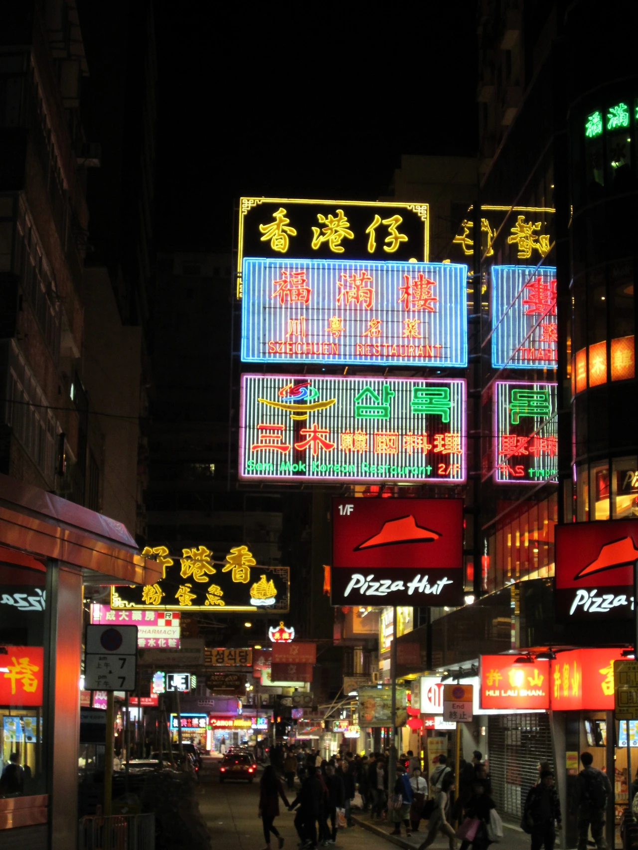어느새 해는 지고 홍콩 야경이 우리 눈 앞에 펼쳐졌다. 홍콩은 크게 홍콩 섬과 구룡반도, 신계지역으로 나뉠 수 있다. 영국의 식민지였던 곳은 홍콩 섬과 구룡반도이고 신계 지역은 99년 기한으로 조차지역이었는데 행정 구역으로 홍콩 섬은 센트럴과 스탠리 지역, 구룡반도는 침사추이와 몽콕 지역으로 어딜 가든지 빽빽한 빌딩과 불야성을 자랑했다. 우리가 내렸던 침사추이 지역은 화려한 네온사인과 수많은 간판들, 바삐 오가는 사람들과 음식 냄새, 거리의 차들이 뿜어내는 경적 소리와 매연이 생기를 넣어주었다. 영화 '중경삼림(重慶森林)'에 등장하는 청킹맨션(重慶大厦)이 있는 곳이 바로 침사추이였다. 영화 제목은 영화의 무대가 되는 이 청킹맨션에서 따왔다. 처음 오는 홍콩의 거리는 활기차고 날씨 덕분인지 우리 같은 여행객 외에 홍콩 사람들의 발걸음도 가벼워 보였다. 이미 저녁시간이 되었기에 호텔에서 간단히 짐 정리만 끝내고 다시 홍콩의 밤거리를 구경하기 위해 나왔다. 생각보다 날은 춥지 않았지만 감기 조심을 위해 아기띠를 한 다음 안고 패딩으로 덮고 밖으로 나왔다. 아직은 품 안에 들어갈 정도로 작기 때문에 아기띠로 안고 다니는 것이 오히려 편하고 양 손을 쓸 수 있으니 좋았다.