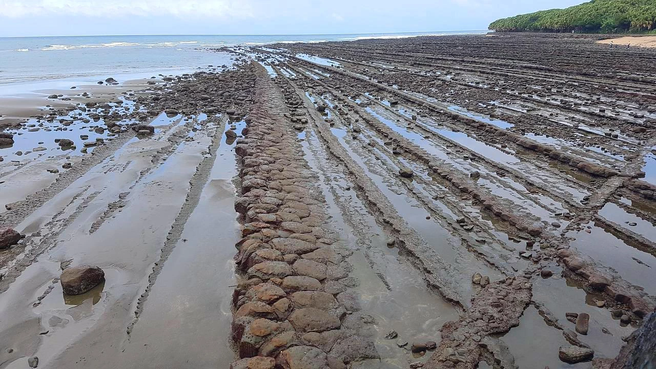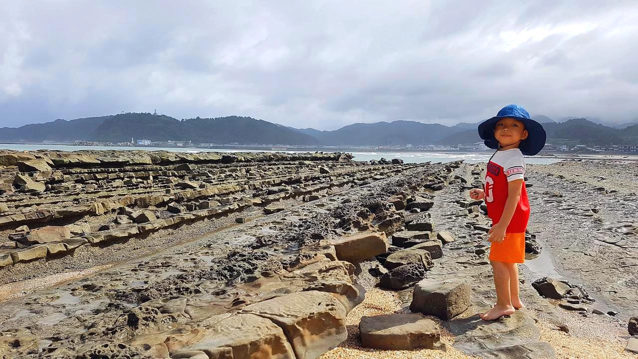 도깨비 빨래판 해변에서신사를 한 바퀴 둘러보고 나오니 도깨비 빨래판(鬼の洗濯岩)이라고 불리는 마치 파도치는 것 같은 모양의 암석층이 광활하게 펼쳐져 있었다. 재미있는 이름을 가진 암석층은 침식 작용으로 인해 만들어진 지형으로 지각 변동의 융기와 침식의 흔적이라고 한다. 전 세계적으로 이곳에만 보이는 특징이라고 하니 자세히 보면 볼수록 결이 가지런히 나 있는 모양새가 신기했다. 그리고 바로 옆에는 해수욕장이 있어서 아이는 윗옷은 벗고 바지만 입고 물놀이를 했다. 모래찜질과 모래놀이도 하고 한 시간 동안 신나게 놀았다. 나도 옷이 젖는 걸 신경 쓰지 않고 아이와 놀았다. 이럴 줄 알았으면 수영복을 챙겨 올 걸 하는 아쉬움이 들었다. 내리쬐는 햇살에 아까의 빗줄기는 사라진 지 오래여서 시원한 바닷물에 몸을 담그고 아이는 행복한 한 때를 보냈다. 한참 놀고 모래만 털어내고 미야자키 신궁으로 향했다.