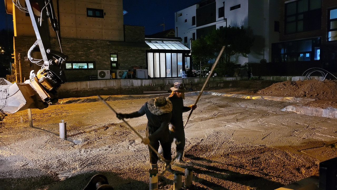 이렇게 작업해 놓은 토지를 보니 어느 정도 규모가 짐작이 갔다. 건물이 놓일 자리가 생각보다 크게 느껴지지는 않았지만 이 공간이 우리가 앞으로 생활할 공간이 된다니 뭔가 신기했다. 레미콘에서 콘크리트가 나오고 그걸 포클레인이 받아서 바닥에 놓으면 밀대로 밀어가면서 펴 바르는 작업이 끝나니 저녁 7시가 되었다. 집을 짓는 과정에서 첫 발을 오늘 내디뎠고 순탄하게 진행되어서 마음이 조금 놓였다. 이른 아침부터 계속 현장에서 애쓴 설계사, 시공 대표, 여러 사람들에게 감사한 마음이 들었다. 공사 끝무렵에는 왼쪽 집에서 구경을 나왔다. 저번에 인사드렸던 사모님과 남편분이 나와서 간단한 안부를 묻고 인사를 나눴다. 준공하는 그날까지 이제 공사의 나날이 시작되었다.