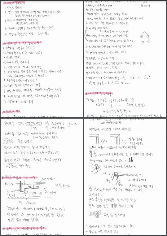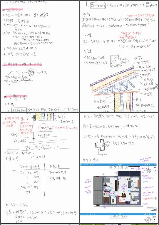 골조는 크게 철근 콘크리트조, 철골조, 목조, 조적조로 나뉠 수 있는데 철근 콘크리트는 우리나라에서 많이 하는 공법으로 철근으로 뼈대를 세우고 콘크리트를 부어서 만드는 공법이다. 철골은 각관이나 H빔 등 철 자재를 활용해서 뼈대를 세우고 패널로 벽을 만드는 공법이다. 목조는 나무를 자재로 기둥을 세우고 벽에 그라스 울처럼 단열재를 채우는 방식이고, 조적조는 벽돌을 쌓는 기법이다. 4개의 공법 중에서 하나를 선택하기 위해 일단 4가지를 다 공부해야 했다. 전혀 바탕이 없는 상태였기에 시작은 막막하기만 했다. 일단 책을 찾아가며 공부하면 가뜩이나 배경 지식이 없는 나였기에 어려울 것 같아서 구조적인 느낌이나 이해가 쉽도록 영상의 도움을 받기로 했다. 동영상 사이트에서 찾아가면서 공법을 하나씩 알아가는데 필기해가면서 반복해서 보니 서서히 눈에 익기 시작했다.