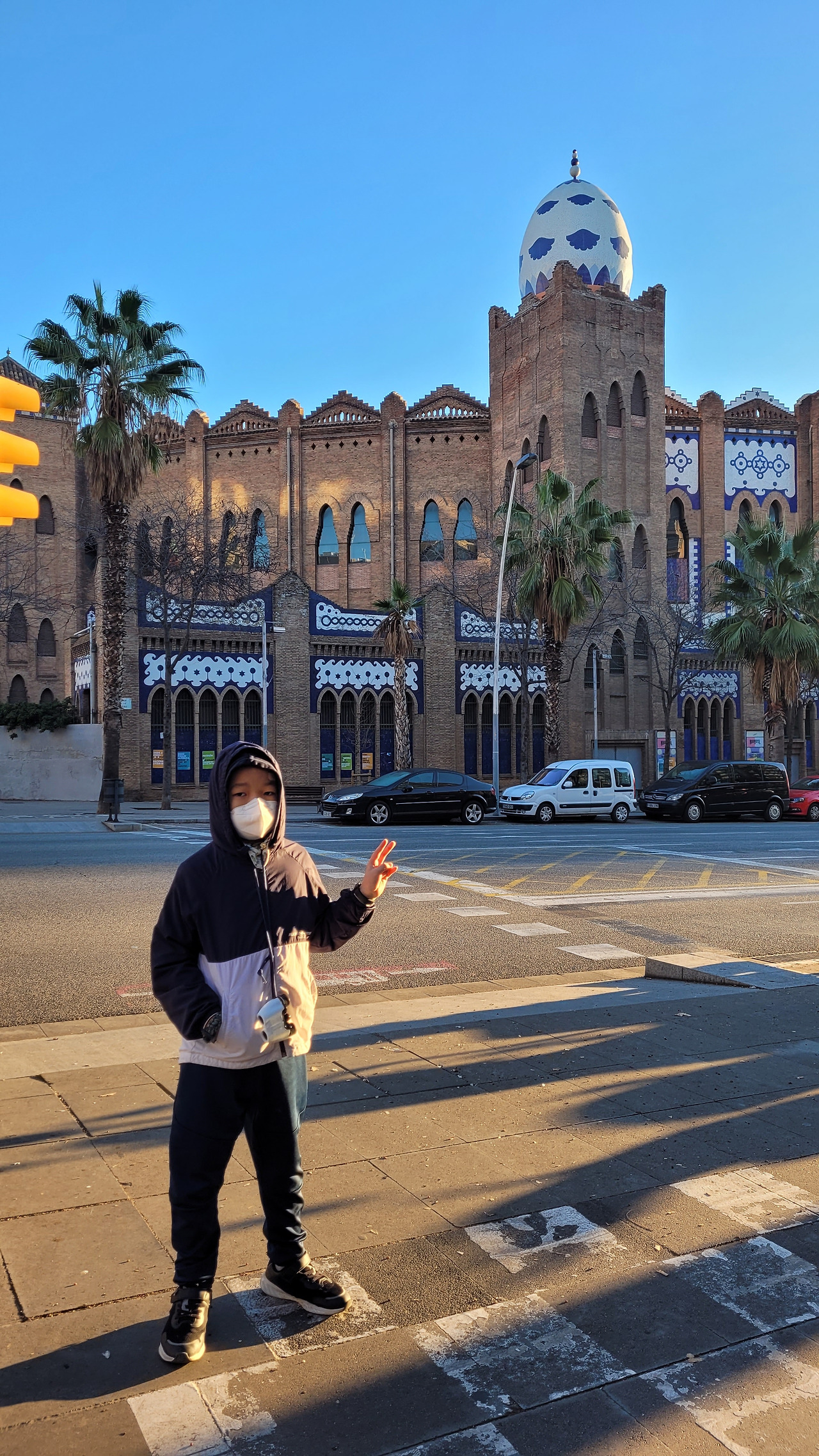 아직은 새벽 기운이 가시지 않은아침에 길을 나섰다. 일출 시간이 8시 이후여서 푸른 빛깔이 감도는 세상이 우릴 기다리고 있었다. 먼저 아내의 제안으로 사그리아 파밀리아 성당을 구경하자고 해서 그리로 향했다. 월요일에 투어 예약을 해놓아서 외관만 보기로 했다. 호텔 근처여서 금방 성당이 보였다. 화면으로만 보던 웅장하고 거대한 모습이 드러나자 내 눈앞에 실제 한다는 것이 놀라웠다. 계속 사진과 영상을 찍자 아이가 배고프다며 가자고 했다. 그래서 근처에 봐둔 카페에 가서 카푸치노 제일 큰 것 2잔과 초코우유, 연어 샌드위치, 시금치 파이, 치즈 케이크, 하몬파이 등을 주문해서 든든하게 하루 열량을 채워나갔다. 거리는 화창해서 구름 한 점 없는 푸른 세상이었다. 왜 이렇게 한적한가 싶었는데 토요일이어서 거리가 한산했다. 사실 이때까지만 해도 오늘 내내 그럴 줄 알았는데 람블라스 거리에서 보기 좋게 빗나갔다. 먼저 개선문을 향해가는 길에 바르셀로나 모누멘탈 투우장이 보였다. 도심 한가운데 투우장이라니 역시 투우의 나라다웠다. 1914년에 지어진 아르누보 양식의 건물로 지금은 내부가 박물관과 공연장으로 사용된다고 했다. 아이는 나중에 꼭 투우를 볼 거라면서 다시 오자고 했다. 사실 카탈루냐 지방은 투우가 금지라서 투우장에서 현재 투우를 하고 있지는 않다. 거리의 축구 연습장에는 아이들이 삼삼오오 모여 경기를 하고 있었고 조깅하는 사람들도 종종 보였다.