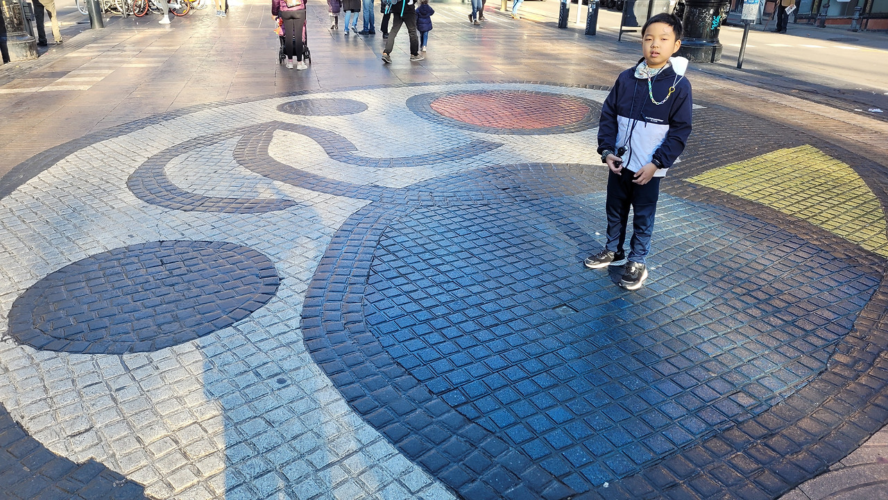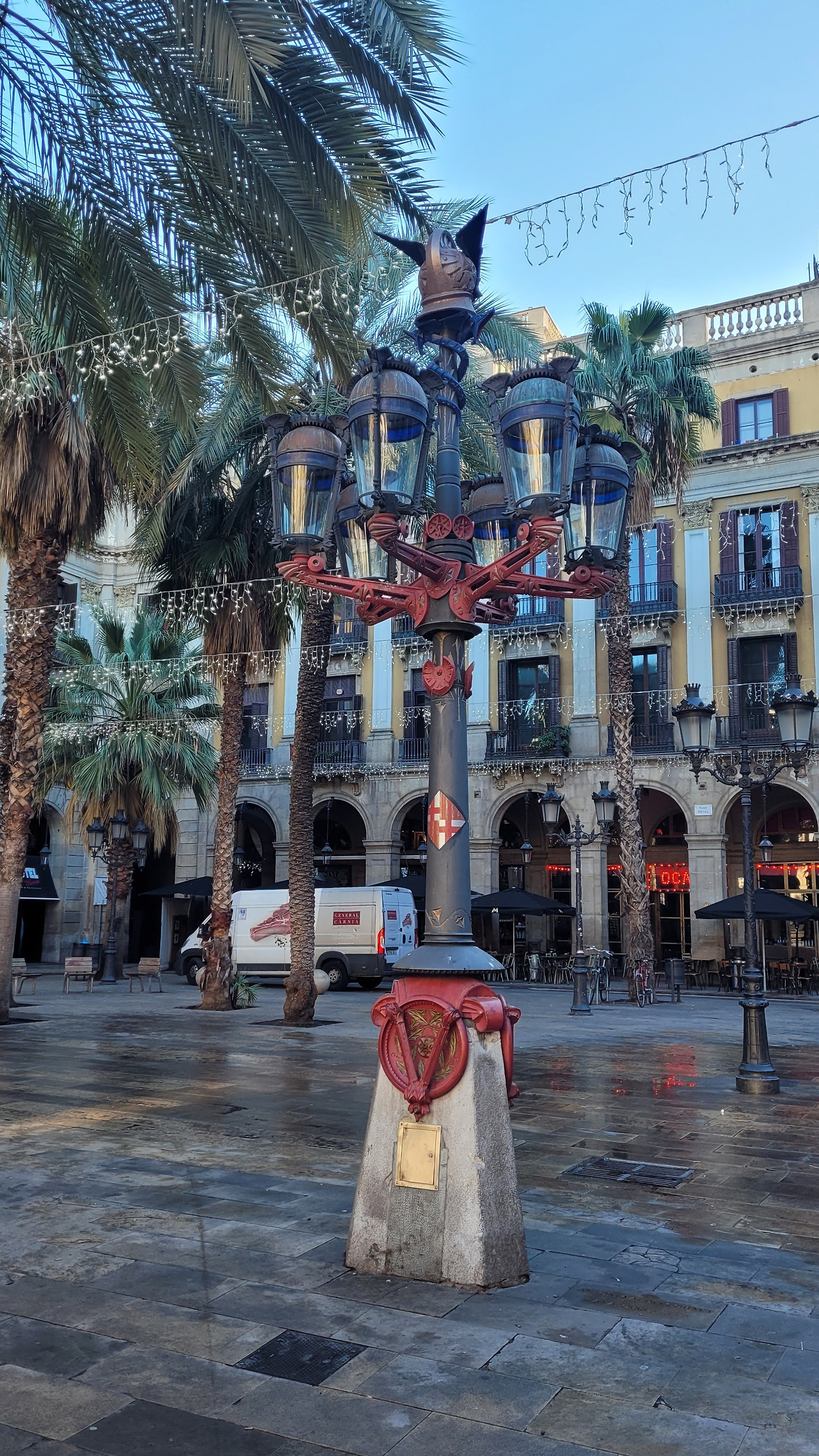 이곳에서 람블라스 거리는 금방이었다. 바르셀로나의 대표적인 거리로 아직 오전이어서 사람들이 많지 않았지만 관광객 상대로 장사하는 테라스 가게, 화가들이 늘어선걸 보니 만만치 않은 곳이라는 게 느껴졌다. 세계 여러 나라의 언어가 들리는 곳이면서 담배는 어찌나 피워대는지 연기를 피해 가는 것도 고역이었다. 먼저 구엘 저택과 레이알 광장을 들렀다. 구엘 저택은 1889년에 지어진 가우디의 든든한 후원자로 유명한 구엘 가문의 저택으로 가우디의 명성과는 다르게 외부는 평이하지만 야외 옥상 정원과 건물 내부는 가우디 특유의 아르누보 감성이 잘 드러나는 곳이다. 레이알 광장은 가우디가 학교를 졸업하고 1879년에 처음 만들었던 가스 가로등이 유명해서 한번 보고 싶었다. 원래 바르셀로나 시내 곳곳에 설치될 예정이었는데 이곳에만 설치가 되어서 특별함을 더했다. 그러고 나서 호안 미로 모자이크를 지나 점심 식사를 할 보케리아 시장으로 갔다. 이 바닥 모자이크는 1893년에 태어나 스페인 미술계의 입체주의와 초현실주의에 큰 영향을 끼친 카탈루냐 출신의 유명 화가인 호안 미로가 1976년에 환영의 의미로 만든 바닥 모자이크로서 오고 가는 사람들이 모자이크를 배경 삼아 사진을 많이 찍었다.