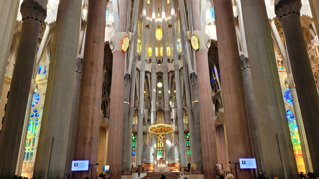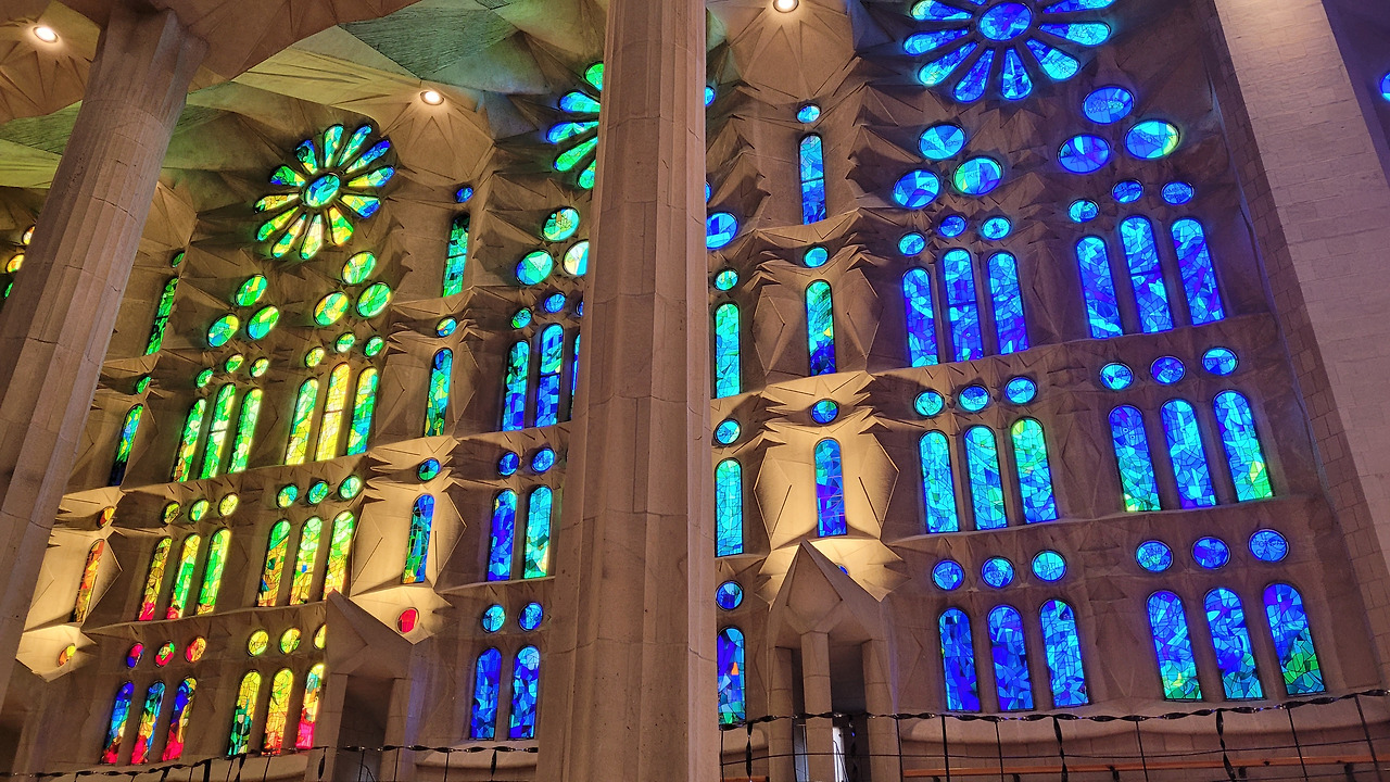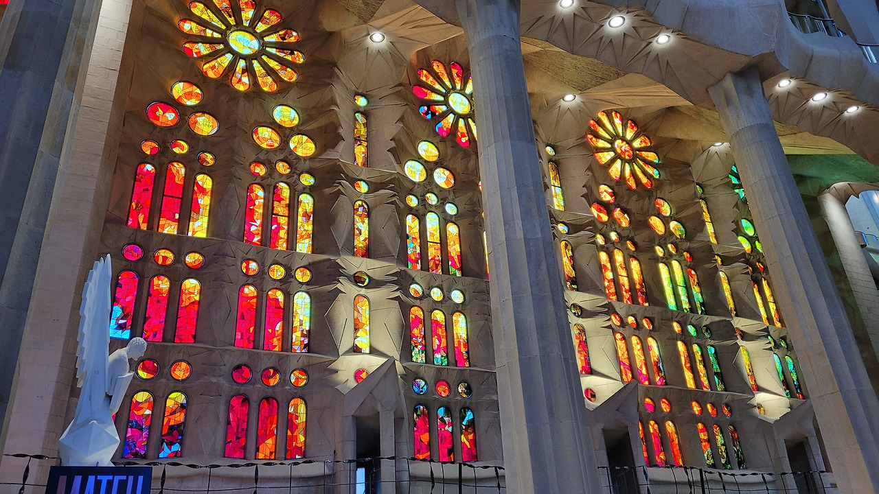 한참을 탄생의 파사드 앞에서 감탄을 하다가 안으로 들어갔다. 성당 내부는 자연에서 영감을 받아 마치 숲 속에 있는 느낌을 갖게 했다. 석조로 된 숲 속으로 들어가서 거대한 나무 기둥들 사이로 거니는 듯한 착각을 불러일으키는 효과가 있었고, 백미는 시간대에 따라서 내부 모습이 변한다는 것이었다. 동쪽에서 해가 뜰 때는 파란색, 초록색, 연두색 등의 스테인드글라스에서 빛이 쏟아져 탄생의 푸른빛이 실내를 채우게 되며 서쪽으로 해가 질 때는 붉은색, 주황색, 노란색 등의 스테인드글라스를 통해 죽음을 담아내게 된다. 오전 시간이어서 햇빛을 받는 탄생의 파사드 쪽은 녹청색 빛을 뿌리고 있었고, 반대쪽 수난의 파사드의 스테인드글라스도 붉은빛을 쏟아내고 있어서 이런 공간에 내가 있다는 것이 놀랍기만 했다. 정말이지 신이 만들어낸 자연의 모습을 담아낸 가우디의 천재성이 돋보이는 순간이었다. 유럽의 여러 성당을 가보았던 나에게 라테라노 성당, 성 베드로 성당, 노트르담 성당, 세인트 폴 성당, 피렌체 두오모 등보다 더 놀랍고 경이로운 곳이 여기였다. 인간의 상상력과 천재성이 발휘된 유일무이의 성당이면서 기존의 개념을 탈피한 성당으로 특별하다는 것으로도 부족해 보였다. 수난의 파사드까지 구경을 하고 지하 전시 공간을 둘러보고 나와서는 주변을 돌면서 마음속으로 감동을 넘치도록 채워나갔다.