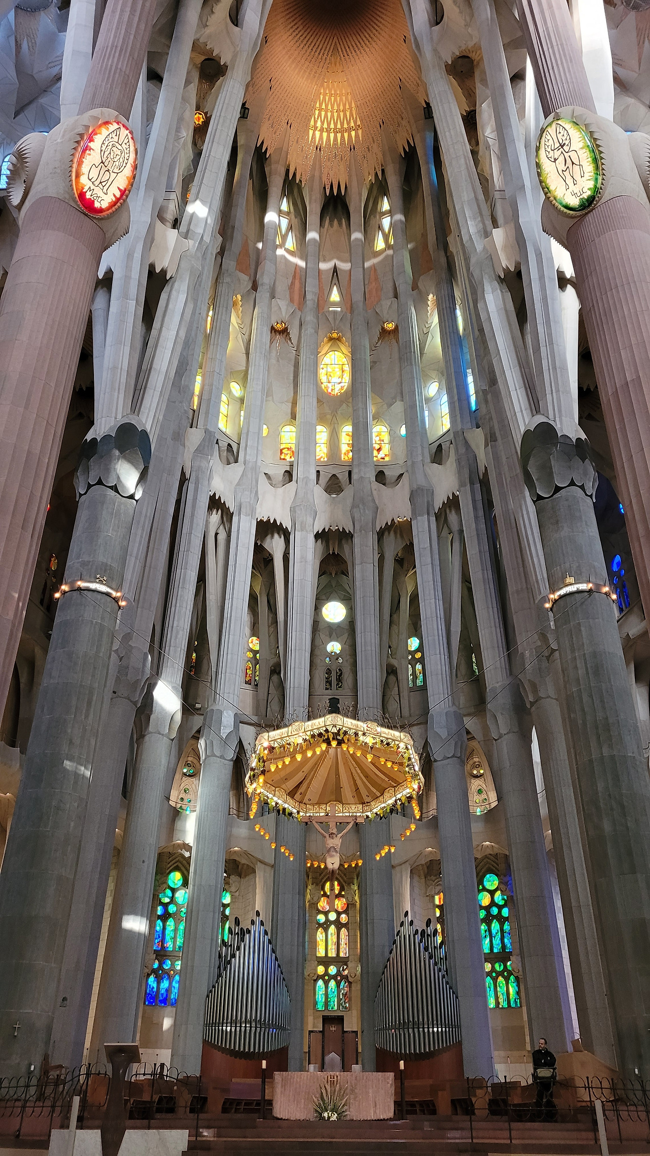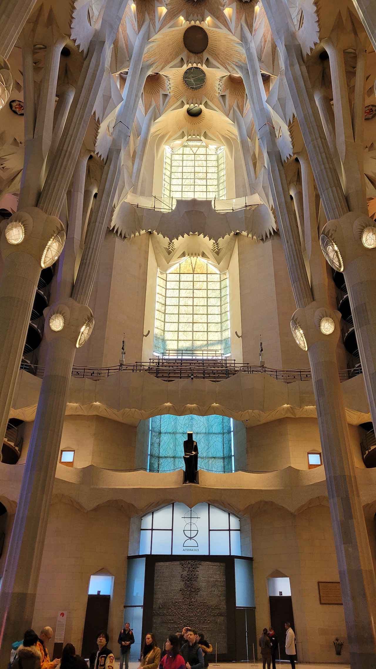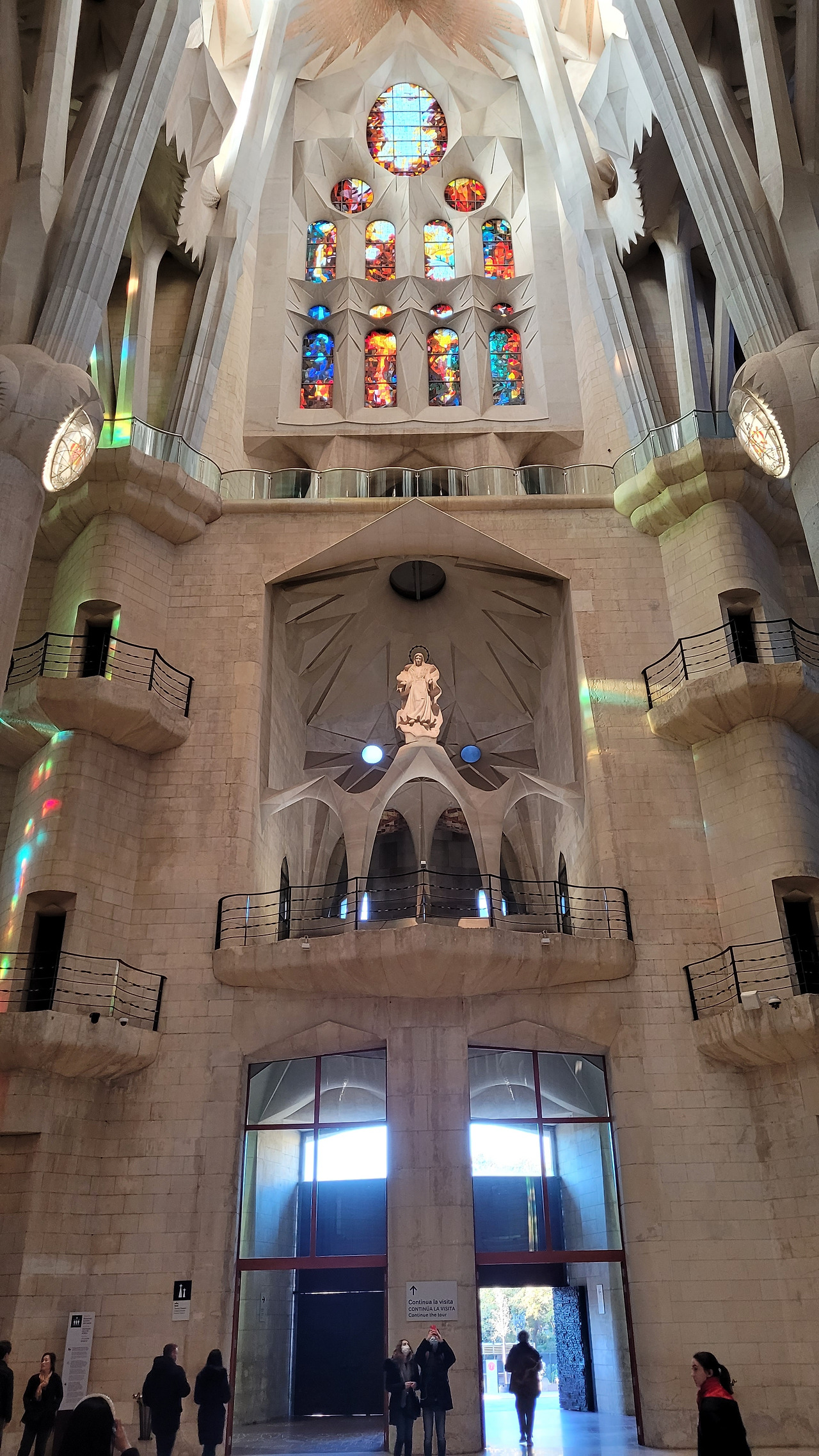 한참을 탄생의 파사드 앞에서 감탄을 하다가 안으로 들어갔다. 성당 내부는 자연에서 영감을 받아 마치 숲 속에 있는 느낌을 갖게 했다. 석조로 된 숲 속으로 들어가서 거대한 나무 기둥들 사이로 거니는 듯한 착각을 불러일으키는 효과가 있었고, 백미는 시간대에 따라서 내부 모습이 변한다는 것이었다. 동쪽에서 해가 뜰 때는 파란색, 초록색, 연두색 등의 스테인드글라스에서 빛이 쏟아져 탄생의 푸른빛이 실내를 채우게 되며 서쪽으로 해가 질 때는 붉은색, 주황색, 노란색 등의 스테인드글라스를 통해 죽음을 담아내게 된다. 오전 시간이어서 햇빛을 받는 탄생의 파사드 쪽은 녹청색 빛을 뿌리고 있었고, 반대쪽 수난의 파사드의 스테인드글라스도 붉은빛을 쏟아내고 있어서 이런 공간에 내가 있다는 것이 놀랍기만 했다. 정말이지 신이 만들어낸 자연의 모습을 담아낸 가우디의 천재성이 돋보이는 순간이었다. 유럽의 여러 성당을 가보았던 나에게 라테라노 성당, 성 베드로 성당, 노트르담 성당, 세인트 폴 성당, 피렌체 두오모 등보다 더 놀랍고 경이로운 곳이 여기였다. 인간의 상상력과 천재성이 발휘된 유일무이의 성당이면서 기존의 개념을 탈피한 성당으로 특별하다는 것으로도 부족해 보였다. 수난의 파사드까지 구경을 하고 지하 전시 공간을 둘러보고 나와서는 주변을 돌면서 마음속으로 감동을 넘치도록 채워나갔다.
