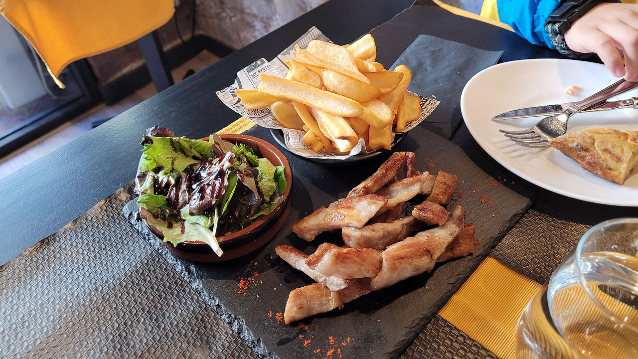 2시간 넘게 시간을 보내서 점심 식사를 이 근처에서 하기로 했다. 그래서 저녁 식사를 하려고 했던 호텔 앞에 있는 레스토랑에서 점심 식사를 하는 게 나을 듯싶어서 사그라다 파밀리아 대성당을 두 눈에 담으며 떠났다. 레스토랑 오픈까지 시간이 조금 남아서 호텔에 들러 두툼한 옷으로 갈아입고 나왔다. 유난히 바람이 부는 날이라 화창한 날씨와 다르게 생각보다 쌀쌀했다. 레스토랑은 호텔 카운터 직원에게 추천받은 식당인데 인터넷 평점도 매우 높았다. 젊고 친절한 사장님은 세심하게 살펴줘서 기분 좋게 식사할 수 있었다. 어디서 왔냐고 물어보길래 한국에서 왔다고 하니 본인은 콜롬비아 출신이고 할아버지가 한국전쟁에 참전했다고 했다. 우리는 이베리코 목살 스테이크, 먹물 파에야, 달팽이 요리, 판 콘 토마테, 오믈렛(토르티야) 등을 주문해서 먹었다. 먹고 나서 한국전쟁 참전의 고마움에 감사의 말을 전하고 같이 사진 찍고 싶어서 찍자고 하니 옆 테이블에서 식사하던 미국인 할아버지가 다 같이 찍어주었다. 계산할 때 카드로 한다며 두 손가락으로 네모 제스처를 취하니 축구에서는 경고 표시라고 하며 한국 사람들이 하는 제스처가 특이해서 재미있다고 했다. 든든하게 배를 채웠으니 다음 목적지인 구엘 공원을 향해 걸었다.