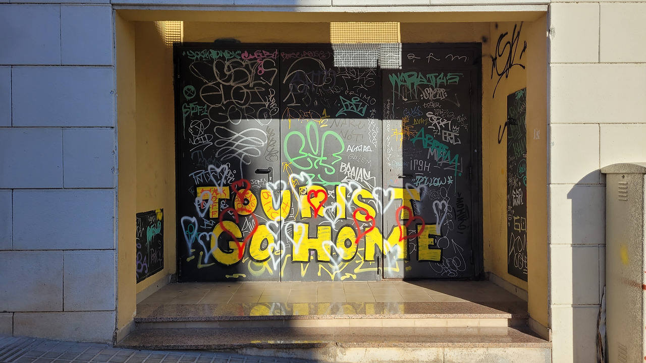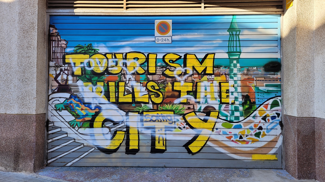 나름 언덕에 있는 곳이라서 거리보다 체감상 힘들게 올라갔다. 내리쬐는 햇볕에 더워져 점퍼를 벗고 반팔로 다녔다. 예약 확인을 하고 입장하니 아까 사그라다 파밀리아 대성당에서 봤던 사람들이 있어서 웃음이 터졌다. 가우디 특유의 건축물과 다리, 조경 등을 보러 온 사람들 속에서 우리도 이곳저곳 다니며 사진으로 순간을 담아냈다. 소원을 비는 작은 웅덩이 같은 곳이 있어서 아이에게 2센트 동전을 주어 던지게 했는데, 빗나가서 아이가 계속 아쉬워했다. 어제도 그렇지만 오늘도 가우디의 작품을 잔뜩 사진 폴더에 담았다. 생각해 보면 이런 가우디의 작품이 있기에 바르셀로나는 영원히 꺼지지 않는 도시가 될 것 같았다. 그런 생각 때문일까, 오버 투어리즘으로 몸살을 앓고 있는 대표적인 도시답게 관람을 마치고 다음 목적지인 벙커에 가는 길에는 '관광객은 집으로 가라' 등의 문구가 눈에 띄었다. 당국은 도시세를 받고 있지만 관광객으로 인한 혼잡이나 땅값 상승 등으로 현지인에게는 세계적인 도시에 사는 일상의 불편함이 고통일 수 있겠다는 생각이 들었다.