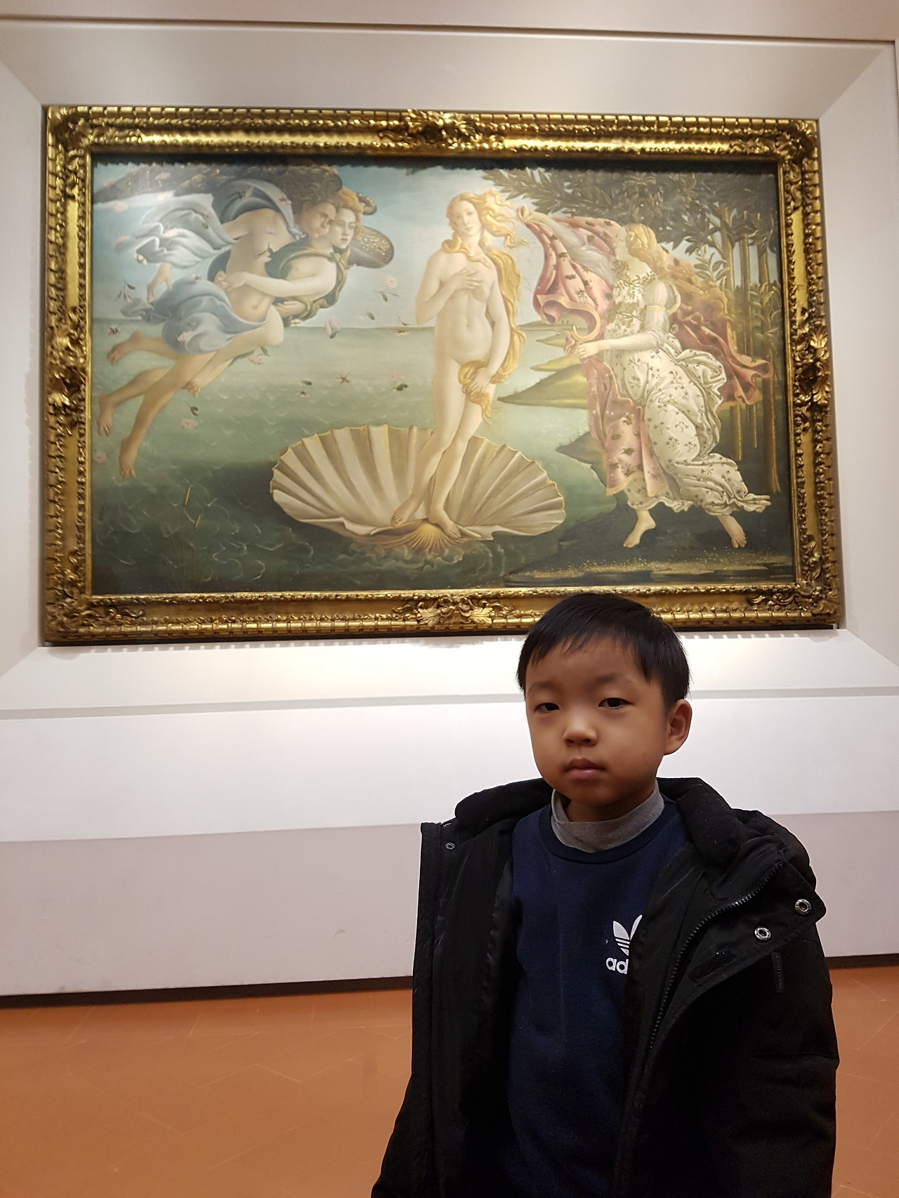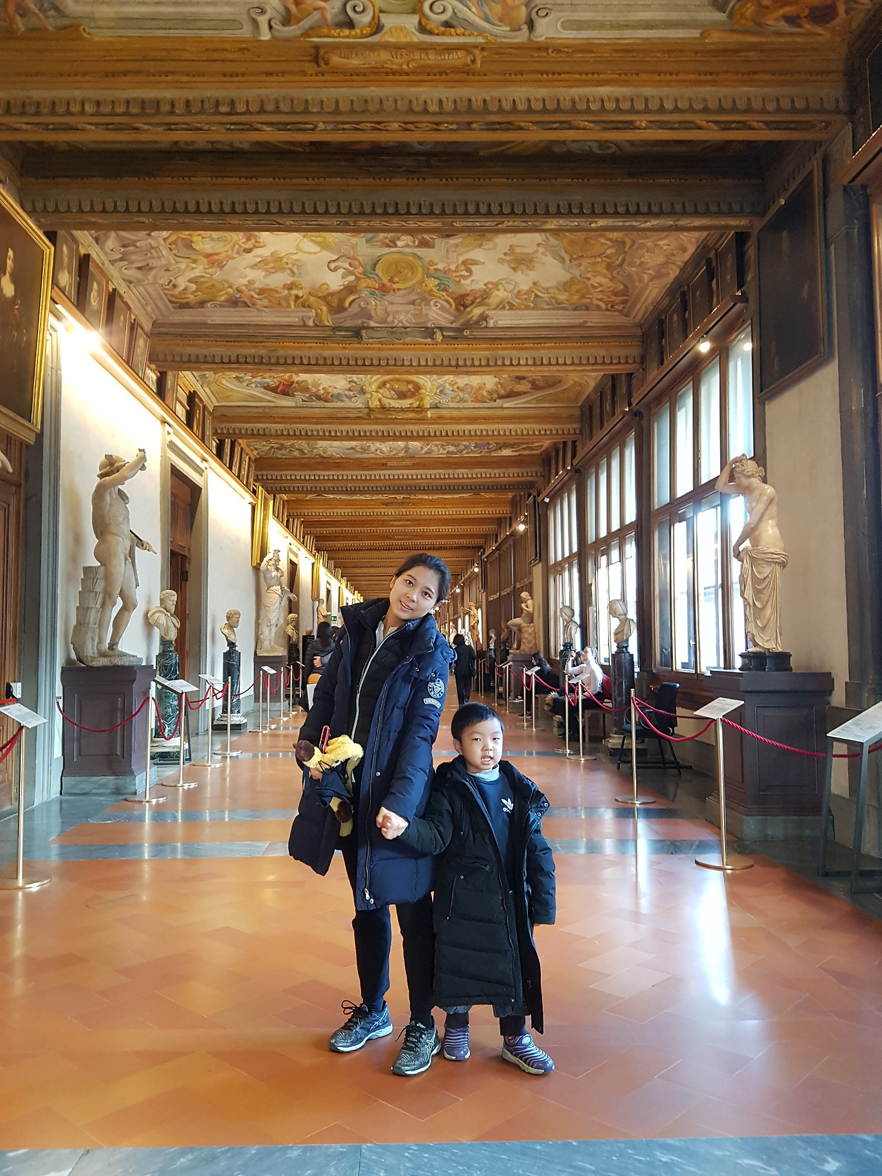 그다음으로 우피치 미술관으로 향했다. 그전에 먹지 못한 늦은 아침을 먹기 위해 근처 카페에 들러서 크루아상, 슈가파우더가 뿌려진 빵, 초콜릿 크림 롤과 에스프레소, 카푸치노를 주문하고 아이를 위해 딸기 젤라토까지 완벽한 이탈리아의 아침 식사를 먹었다. 우피치 미술관을 가는 길은 화창한 날씨 덕분에 피렌체 시내가 더욱 선명하게 드러났다. 시뇨리아 광장에서는 나귀들이 여물을 먹고 있어서 르네상스 시기로 온 것 같은 착각이 들었다. 우피치 미술관에서는 우리 셋이 같이 다녔는데 피렌체 패스가 없어도 대기 시간 없이 바로 입장할 수 있어서 운이 좋았다. 표가 있다고 금방 들어가는 것이 아니라 일정 인원을 들여보내기 때문에 성수기에 가면 오래 기다릴 수 있다. 피렌체에서 빼놓을 수 없는 메디치 가문이 수집한 미술품들을 모아놓은 우피치 미술관은 세계적으로 르네상스 회화의 보물들을 대량 보유하고 있는 미술관으로서 루브르, 오르세나 영국박물관, 메트로폴리탄 박물관보다는 크기가 작지만 르네상스 시기의 회화, 조각, 작품만 놓고 보면 능가할 미술관이다. 보티첼리의 '비너스의 탄생'과 '봄의 향연', 티치아노의 '우르비노의 비너스', 레오나르도 다빈치의 '수태고지', 라파엘로의 '어린 요한과 함께 있는 예수와 성모', 카라바조의 '바쿠스' 등 보물 같은 작품들이 방마다 있어서 이름만 들어도 유명한 화가들이 잔뜩 있는 전시실을 옮겨 다니는 게 힘겨울 수밖에 없었다. 그 외에 메디치 가문의 초상화, 마르틴 루터 초상화나 라오콘 상 등이 있어서 신선한 즐거움을 주었다. 회화 작품이 3층에 몰려 있기에 우린 바로 3층으로 올라가서 내려가는 식으로 보기로 했다. 불후의 명작을 눈에 담으려는 세계의 여러 관광객들과 함께 작품을 둘러보는데 아이는 역시 의자 찾아 삼만리였다. 관심이 도통 없으니 데리고 다니며 관람하는 것도 하나의 일이었다. 나중에 찍힌 사진을 보고 이 그림 하면서 외치겠지만 아직은 그저 이름 모를 그림일 뿐이다.