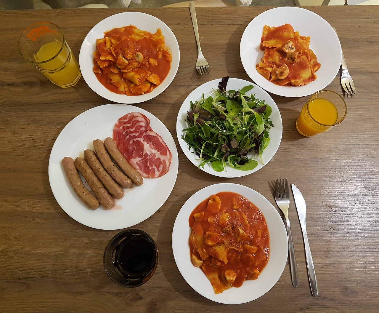 저녁으로 준비한 요리는 토마토 라비올리 파스타와 샐러드, 저민 햄과 소시지였다. 프랑스 파리에서 식비로 너무 많은 돈을 써서 이탈리아에서는 최대한 숙소에서 해 먹기로 했기에 특별히 실력 발휘를 해보았다. 우리나라는 거의 대부분이 건면 파스타였는데 이곳은 신선한 생면 파스타가 많이 있어서 여러 가지를 골라와서 요리해보았다. 우리나라에서는 잘 볼 수 없는 식자재였기에 여기서 구입해 만들어 먹는 재미가 있었다. 아내는 예쁘고 맛있어 보인다고 칭찬을 했고 아이도 파스타가 맛있다며 잘 먹었다. 식사를 마치고 아내와 와인 한 잔을 하려고 햄을 굽고 그 위에 치즈를 뿌려 안주로 내놓은 다음 둘이서 와인 잔에 이탈리아 와인을 담아 첫 날을 자축했다. 아이는 치즈를 뿌린 햄을 먹다가 치즈에서 오줌 맛이 난다며 먹지 않았다. 그리고는 사온 초콜릿과 팝콘에 관심을 더 많이 가졌다. 이렇게 우리 여행의 하이라이트인 로마 여행이 시작되었다.