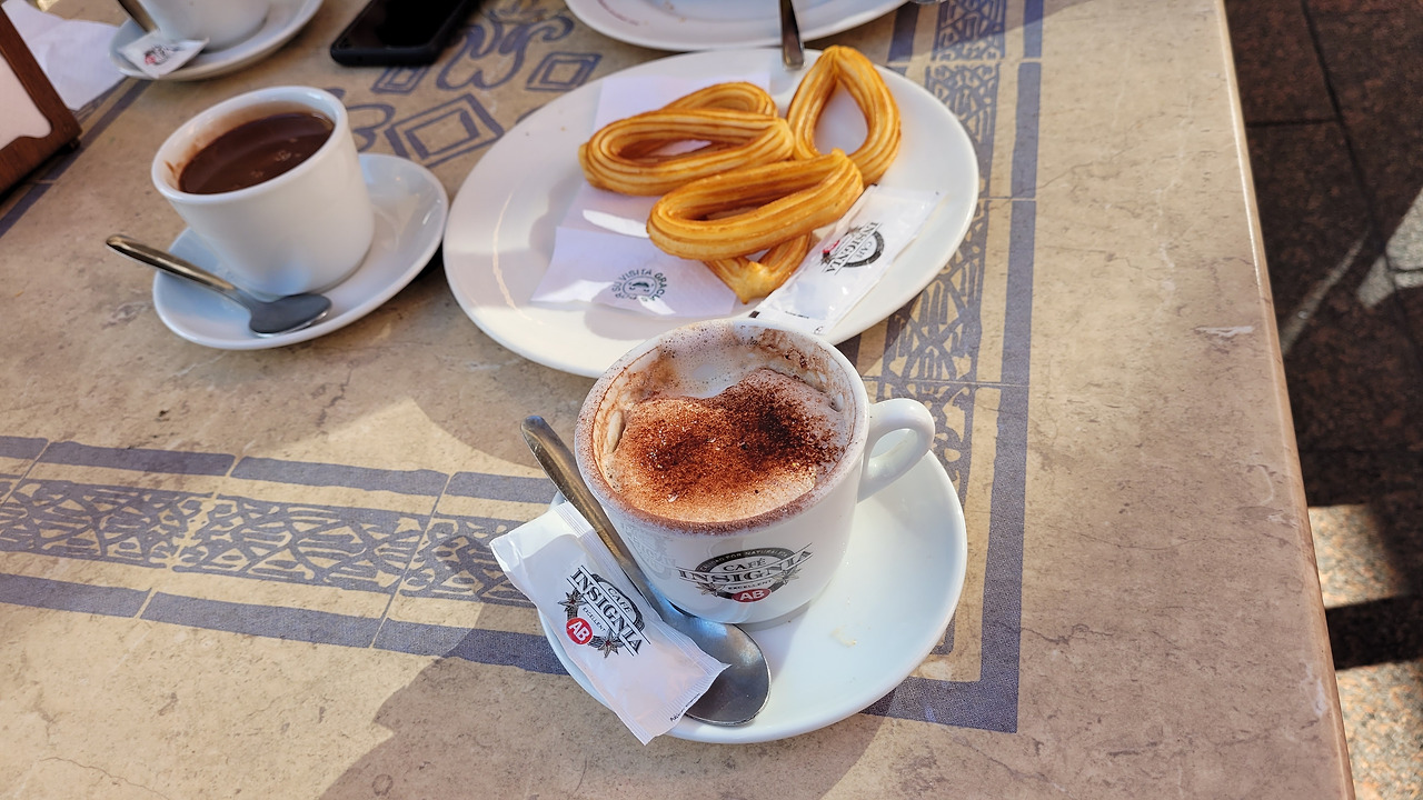 구름 한 점 없는 파스텔의 푸른색으로 그려진 세비야의 아침, 스페인의 마지막 날이 밝았다. 이번 여행의 전반기에 해당하는 스페인에 대해 태양처럼 눈부시게 마음속에 담고 갔다. 호텔 체크 아웃을 하고 근처 살바도르 성당 앞 광장 카페에 가려했지만 노천에 자리가 없어서 세비야 시청 광장 쪽으로 나왔다. 따사로운 햇살 아래 한가로운 낮을 보내는 사람들이 많았다. 한 노천카페의 자리에 앉아 크루아상, 햄치즈크루아상, 추로스에 카푸치노, 카페 콘 레체, 오렌지 주스를 먹으며 공항 가기 전까지 여유를 즐겼다. 여행의 8할은 날씨라고 생각할 정도로 날씨를 중요하게 생각하는데 스페인은 다행스럽게 하루도 비가 온 날이 없었다. 리스본에는 우리가 3일간 머무는데 2일이 소나기 소식이 있어서 다닐 걱정이 되긴 했다. 오늘 도착하는 대로 여기저기 둘러봐야 할 것 같았다.