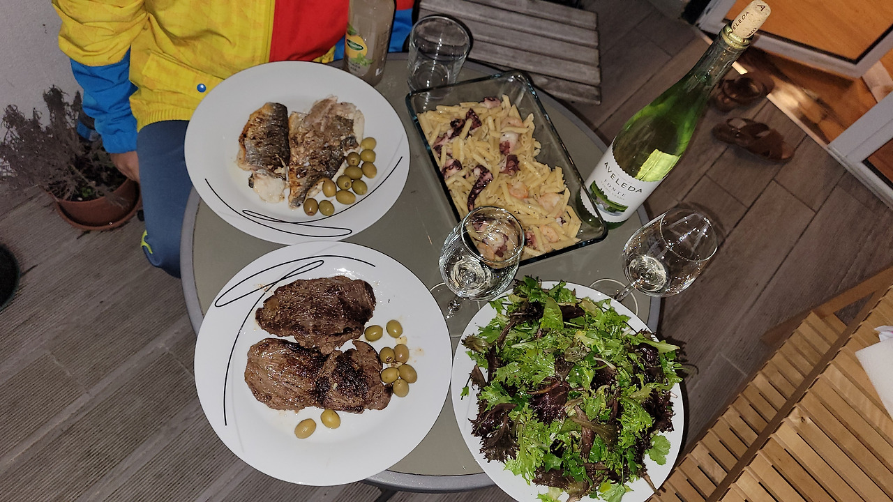 저녁 식사를 마트 가는 길에 레스토랑에서 하려 했는데 일요일이라 그런지 마땅한 곳이 없어서 마트에서 대구, 새우, 소고기, 문어, 모둠 해산물, 파스타, 샐러드 등과 포르투갈의 명물인 그린 와인, 비뉴 베르데(Vinho Verde)까지 샀다. 비뉴 베르데가 그린 와인이라고 불리는 건 녹색이어서가 아니라 어린 포도를 가지고 와인을 만들고 1년 안에 소비되기 때문이다. 숙소까지는 택시를 타고 돌아왔다. 골목길 사이를 요리조리 다니는 기사님이 대단해 보였다. 숙소에 들어올 때 내부 문 열쇠가 잘 안 돼서 또다시 파리 숙소 생각이 나서 아찔했다. 주인에게 물어보고 다시 해보니 얼떨결에 돼서 무사히 들어왔다. 저녁 메뉴는 포르투갈에서 유명한 대구 구이, 스테이크, 새우와 문어 펜네 파스타를 하고 와인을 곁들였다. 지붕 테라스가 있어서 테주 강에 정박한 크루즈를 보며, 밤하늘을 보며, 별을 보며, 계단 가로등을 보며 식사를 했다. 아랑훼즈 협주곡을 들으며 느긋하게 리스본의 밤공기와 분위기를 즐겼다. 마지막엔 컵라면까지 하나 끓여서 방점을 찍었다. 2시간이 넘어간 식사때문에 이미 밤 12시가 되어 늦은 잠자리에 들었다.