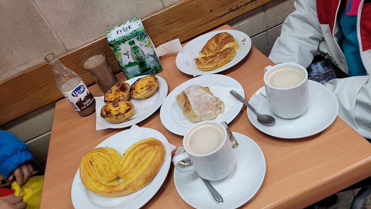 혹시 몰라서 접이식 우산을 챙겨서 나왔다. 다행히 비는 안 내리고 흐리기만 해서 아침 겸 점심을 먹기 위해 열심히 걸었다. 숙소 주인아주머니가 알려준 빵집으로 가서 카페 라테 2잔, 초코우유 1병, 에그 타르트 3개, 하트 페스추리 1개, 낙엽 빵 1개, 추천받은 담백한 빵 1개를 주문해서 먹었다. 아이는 어제 먹은 에그 타르트보다 더 맛있다고 했다. 이렇게 주문했는데 9유로 정도 나와서 저렴한 가격에 깜짝 놀랐다. 우리나라의 물가가 비싼 건지 모를 일이었다.
