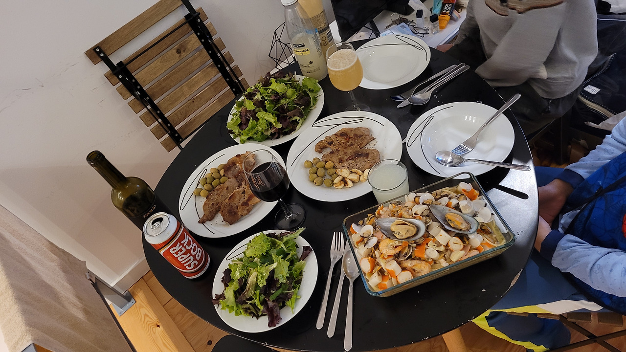 전망대 둘러보기를 마치고 아내가 트램 배경으로 사진을 남기고 싶다 해서 오가는 트램을 기다리고 사진을 찍고 나서 마트에 갔다. 어제 소고기 스테이크를 요리할 때 화력이 약해서 육즙이 빠지고 식었을 때 질겨져서 돼지고기 목살과 주스, 즉석 피자, 샌드위치, 과자, 견과류, 샐러드 등을 사서 왔다. 오늘 저녁 식사 메뉴는 모둠 해산물 파스타, 돼지 목살 구이, 샐러드에 레몬 주스, 코코넛 파인애플 주스, 레드 와인이었다. 아이와 아내 모두 맛있다며 잘 먹었다. 레드 와인은 마시다가 레몬주스를 섞어 틴토 데 베라노를 만들어먹었다. 과자와 견과류까지 꺼내 리스본의 둘째 날 밤을 이어갔다. 와인이 달달한 틴토 데 베라노가 되어 이베리아 반도의 취기에 밤은 물들었다.