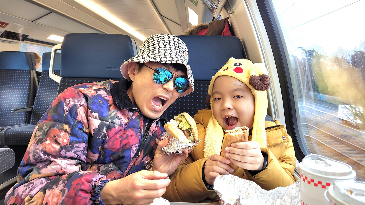 역으로 돌아가는 길에 점심시간이 애매해서 파이브 가이즈가 있길래 고민 없이 들어갔다. 햄버거 2개, 치즈핫도그 1개, 콜라 1잔을 샀는데 51.4스위스프랑(약 7만 원)이 나와서 엄청난 스위스 물가를 체감했다. 우리를 쫄깃하게 만든 건 이때까지 이게 전부인 줄 알았다. 베른 가는 기차를 타야 하는 플랫폼을 6번이라고 아내가 봐서 6번으로 갔는데 기차 문이 안 열리고 전혀 타는 분위기가 아니어서 5분 남았을 때 나와 아이는 플랫폼에 있고 아내에게 다시 물어보고 오라고 했다. 아내는 역무원에게 물어보니 6번이라고 했는데 전광판에는 4번이라고 되어있어서 불안한 찰나에 4번 플랫폼으로 2층 기차가 들어왔다. 왠지 이 기차인 것 같아서 서둘러 탔다. 2층으로 올라가서 자리를 잡고 앉으니 이제야 긴장했던 마음이 풀리는 듯했다. 사온 버거를 먹으면서 창밖으로 지나가는 겨울 풍경을 담았다. 레만 호수와 작은 집들, 경사진 밭, 나무들, 눈 덮인 세상이 겨울 왕국 같았다. 아내는 감동받았는지 한참을 쳐다보았다. 이런 풍경은 사진이나 영상보다 직접 두 눈으로 보는 게 제일 나았다.