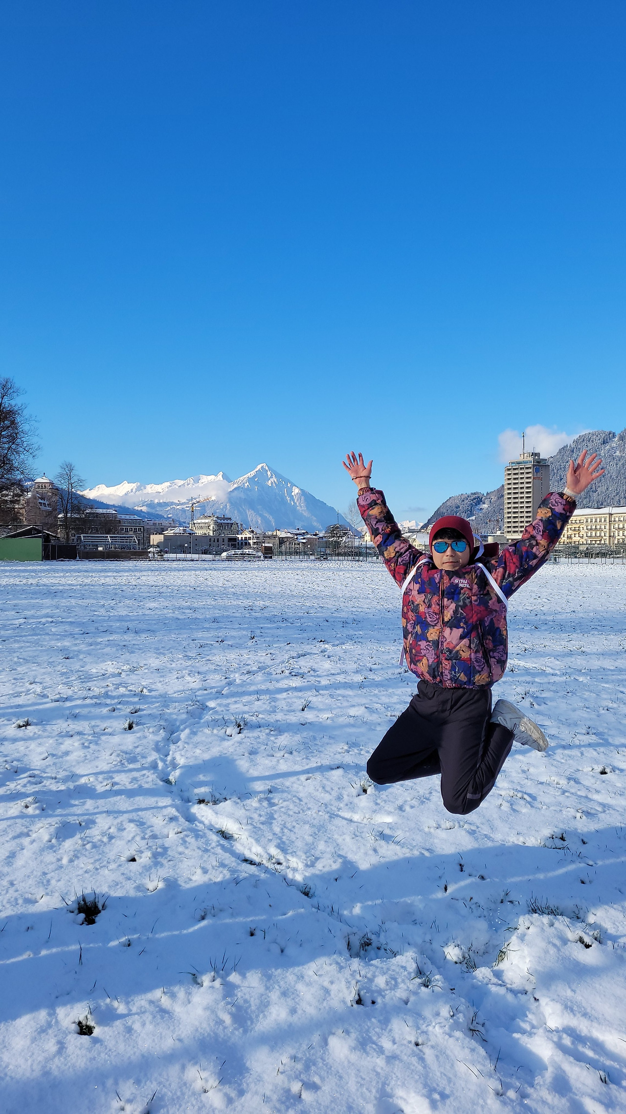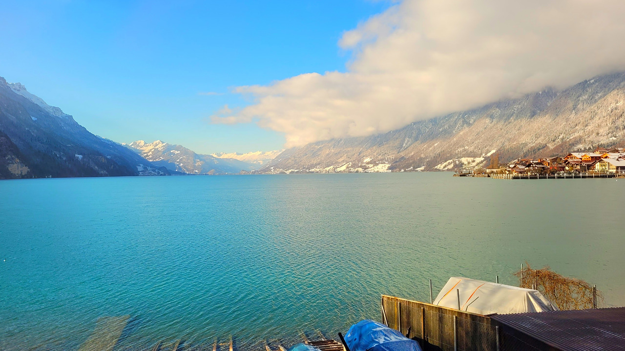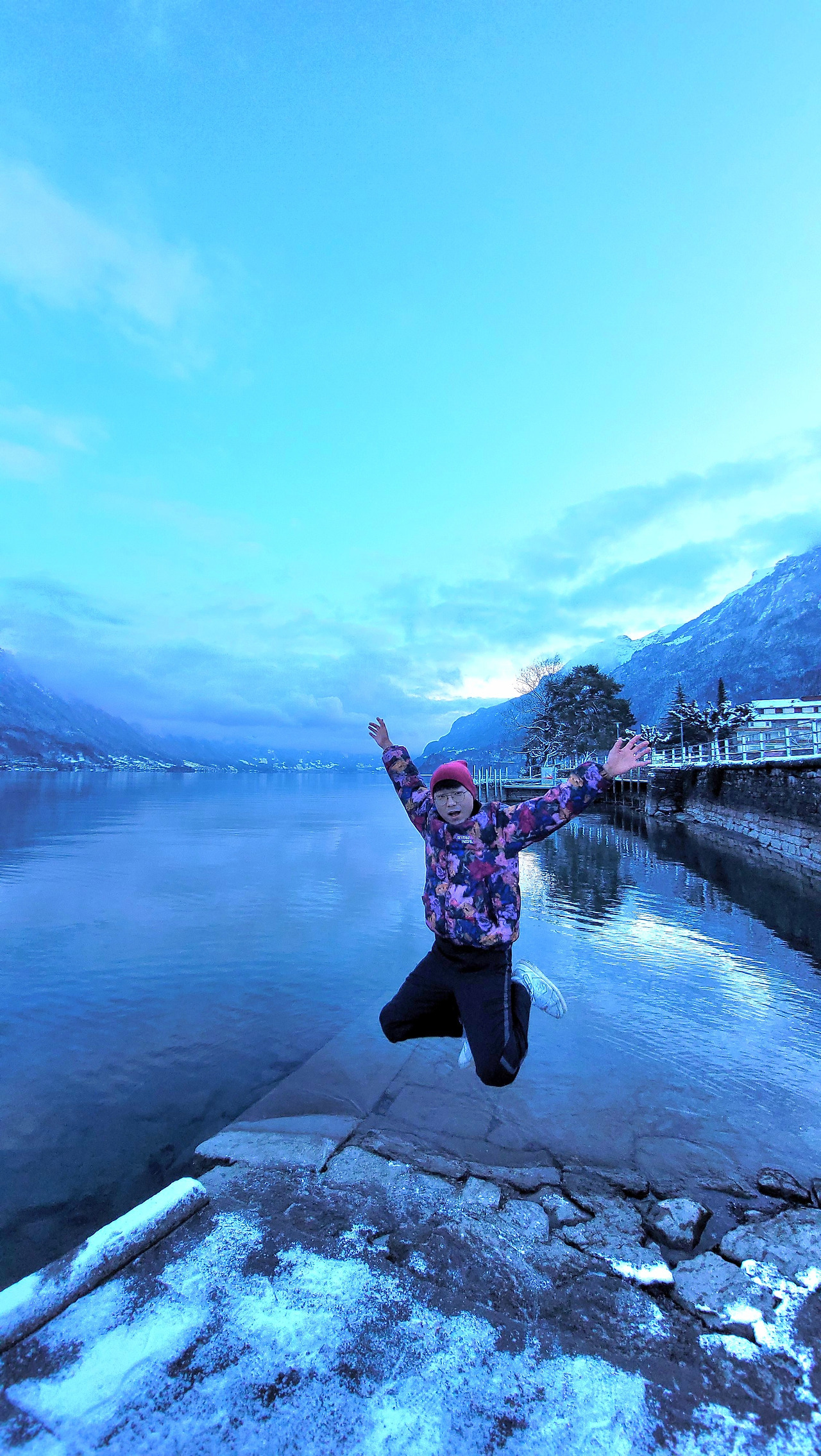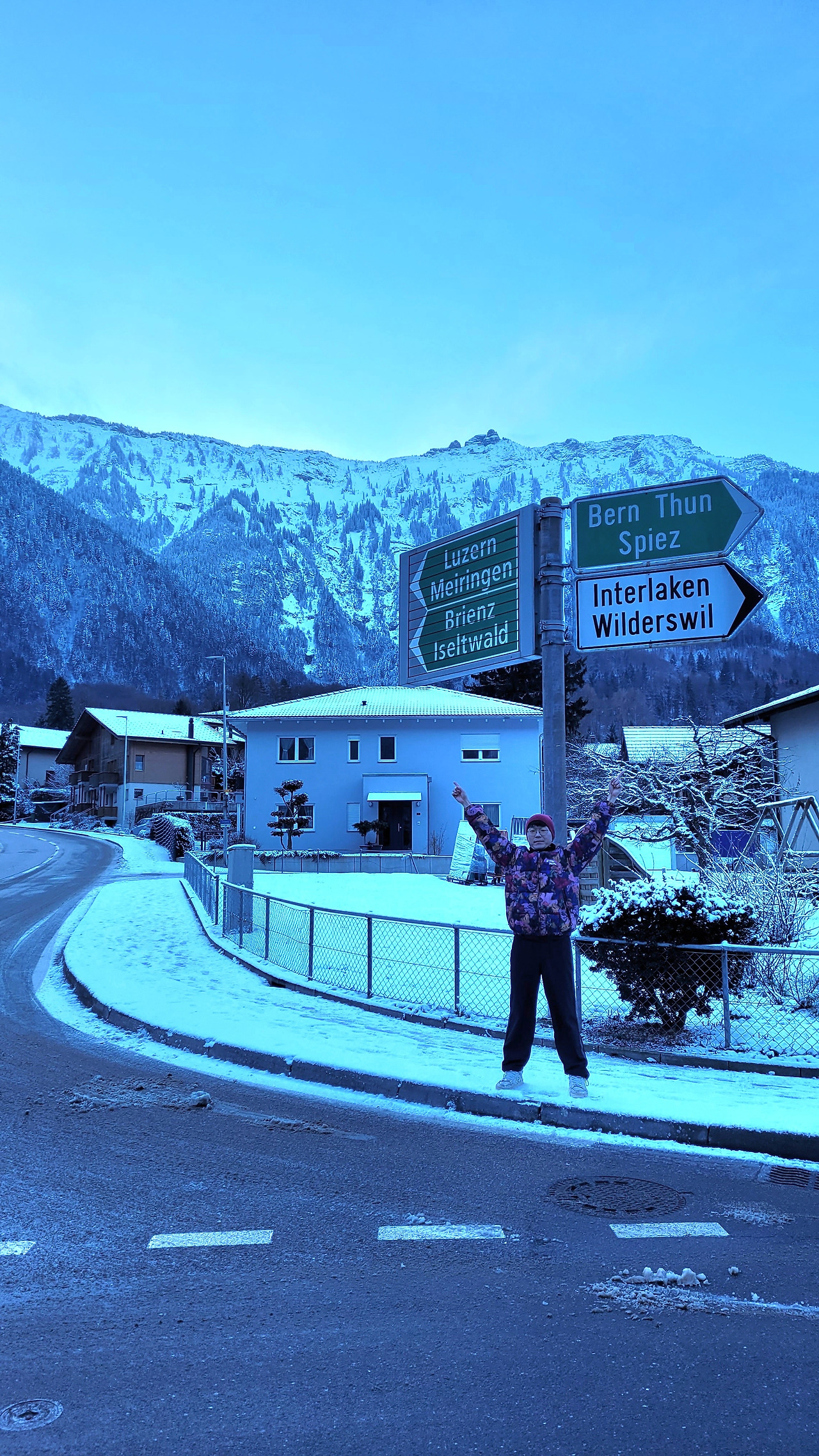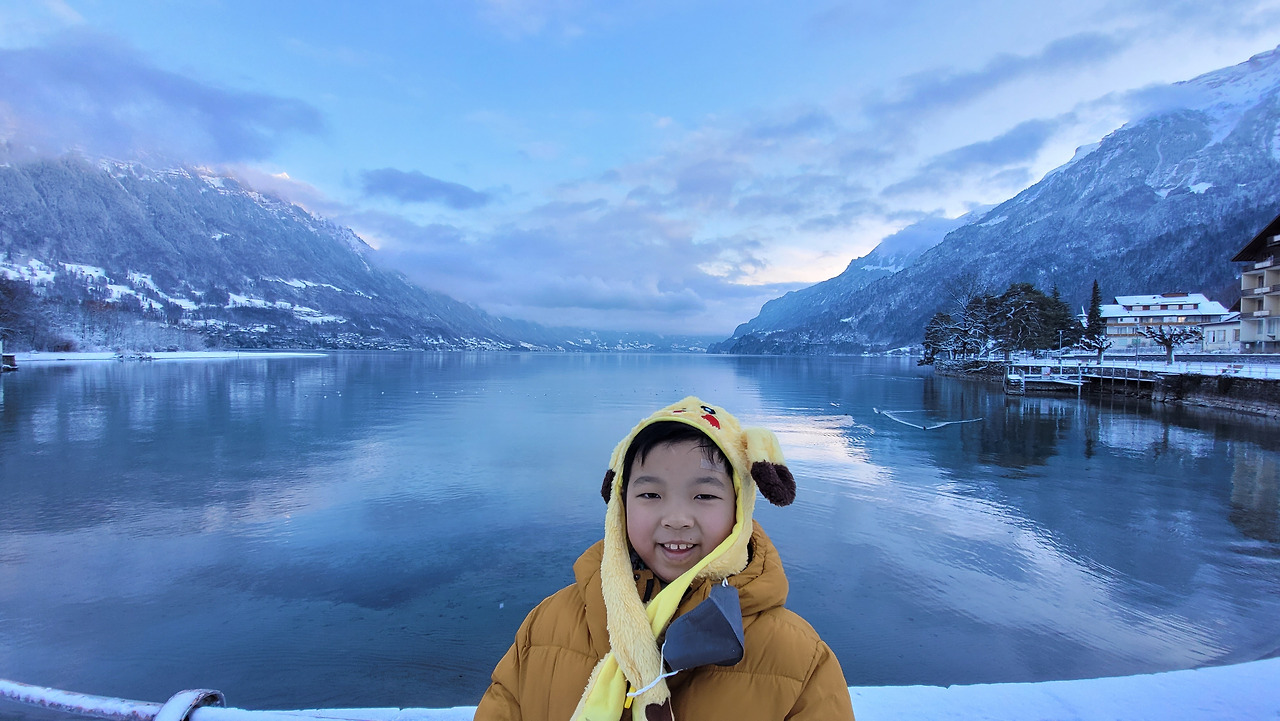 알프스의 이른 아침 공기를 느껴보며 식사 준비를 했다. 간단하게 달걀 프라이에 어제 사 온 빵을 데우고, 마멀레이드 잼을 발랐다. 커피 머신이 있어서 커피도 내려서 따뜻한 식사를 했다.추운 날씨여서 다들 단단히 준비를 하고 숙소 밖으로 나갔다. 눈이 그치고 푸르고 시린 공기가 세상을 품고 있었다. 알프스 산맥이 병풍처럼 둘러싼 인터라켄은 튠 호수와 브리엔츠 호수 사이에 있는 작은 도시로 우리는 브리엔츠 호수를 보기로 했다. 한 40분 정도 걸어가며 낯선 곳에서 사는 사람들의 모습도 보고 풍경도 사진으로 남겼다. 날이 추웠지만 걸으면서 둘러보면 알프스가 우리를 감싸고 있는 듯해서 우리의 눈동자는 황홀했다. 특히 우뚝 솟은 설산의 위용은 장관이었다. 브리엔츠 호수는 알프스의 만년설이 녹아내렸는지 짙은 옥색을 띠며 황홀한 풍경을 우리에게 선사했다. 호수에는 우리뿐이어서 이런저런 사진을 많이 찍었다. 푸른 호수를 두 눈동자에 가득 담고 다시 숙소로 돌아갔다. 언덕에서 엉덩이 눈썰매를 타며 아이가 엄청 좋아했다.