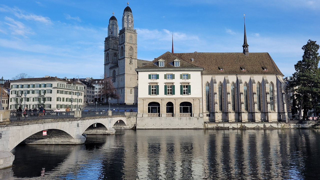 취리히 역은 국제 도시답게 큰 규모를 자랑했다. 내가 사는 도시와 인구는 비슷하지만 철도역만큼은 확실히 컸다. 호텔이 근처라서 천천히 걸어갔는데도 일찍 도착해 조금 이르게 체크 인을 했다. 도로를 사이에 두고 아인슈타인이 수학했던 취리히연방공과대학 건물이 있었다. 아기자기한 옛 골목인 니더도프를 지나서 이 유서 깊은 도시에 첫 번째로 방문한 곳은 그로스뮌스터였다. 두 개의 종탑이 멋진 이 교회는 츠빙글리의 종교개혁이 시작된 곳이었다. 그리고 오래전 프랑크 왕국의 샤를마뉴 대제가 이곳에서 취리히 성인 무덤에 무릎을 꿇어서 이 자리에 수도원 성당을 세웠다고 한다.
