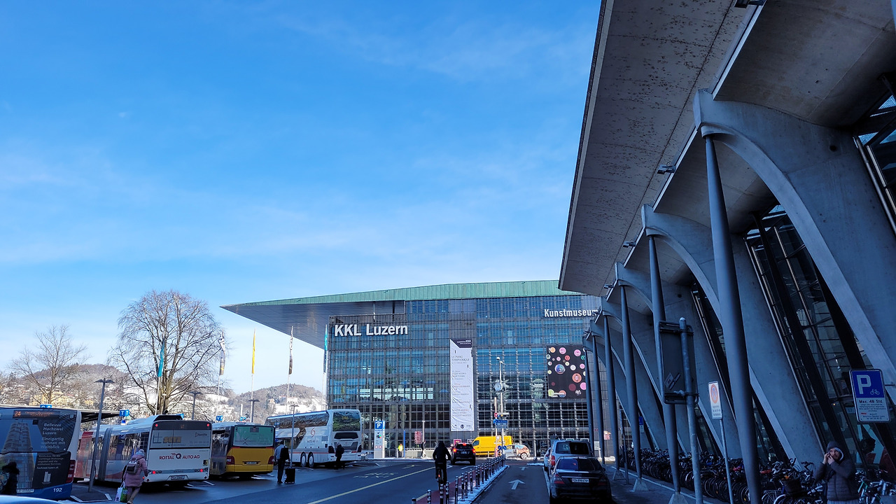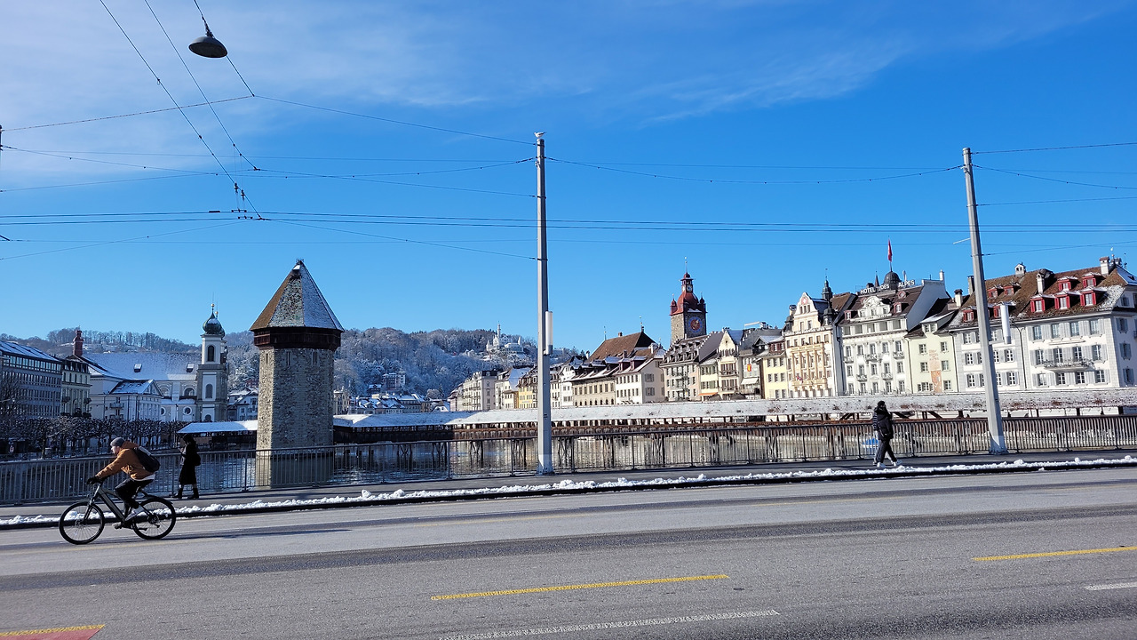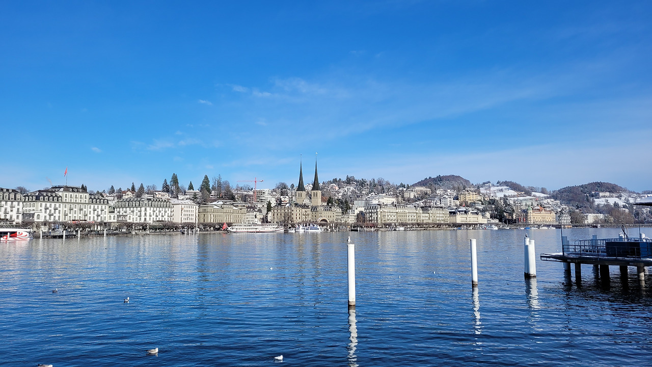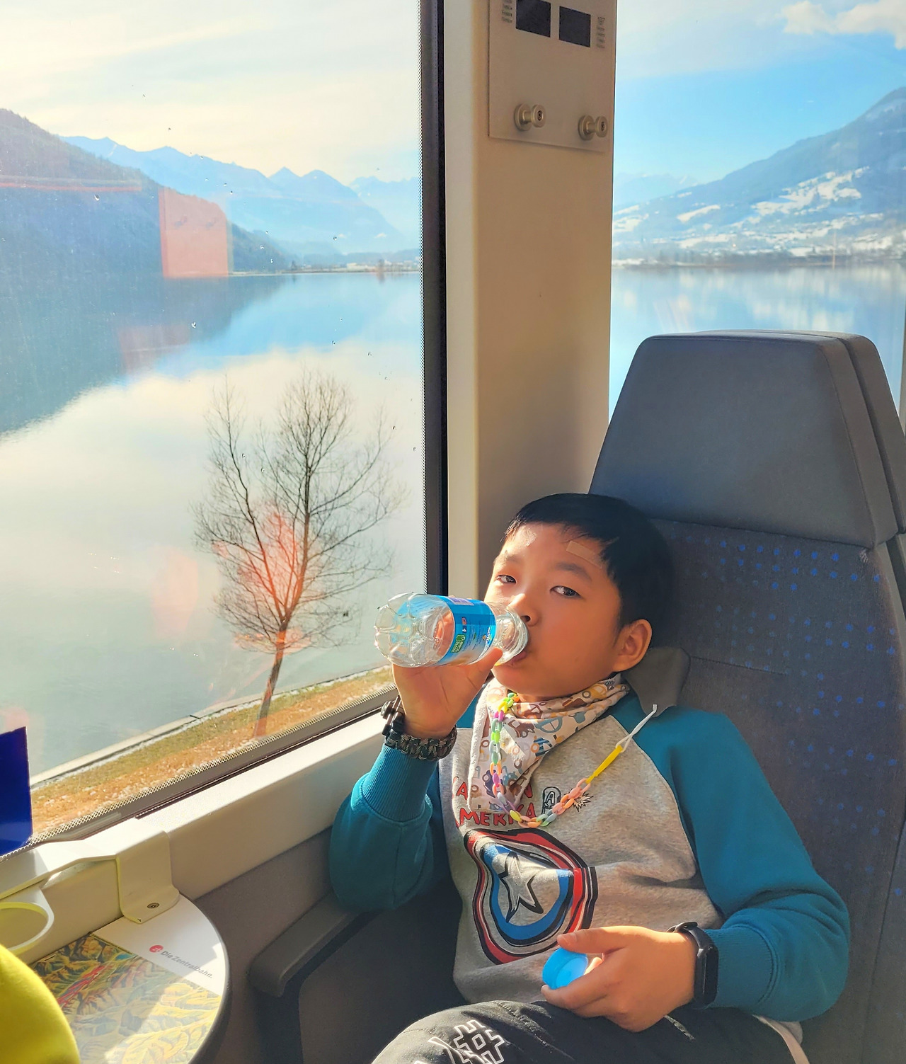 숙소에 돌아와서 짐을 챙기고 이제 인터라켄 동역으로 향했다. 가는 길은 인터라켄의 메인 거리라고 할 수 있는 회에벡 거리를 지나면서 페러글라이딩 하는 모습도 보고 알프스를 배경 삼아 사진을 찍었다. 풍경이 아름다우니 어디를 찍어도 엽서 같았다. 기차 안에서 먹을 점심을 사러 근처 마트에 들렀다. 아이스티, 초콜릿 우유, 물, 빵, 샐러드, 커리 덮밥, 불고기 덮밥 등을 사서 기차에 탑승했다. 평일 오전이어서 그런가 기차 안은 매우 한산했다. 덕분에 자리를 넓게 차지하고 루체른에 갈 때까지 알프스 산맥과 마을, 호수 등 구경을 실컷 했다. 우리가 탄 노선은 알프스 산맥을 끼고 지나가는 노선으로 흔히 말하는 골든 패스 라인으로 알프스 파노라마 열차로 불린다. 베른 경유가 아닌 루체른 경유로 예약을 한 이유가 여기 있었다. 베른 경유하는 노선은 많았지만 알프스를 끼고돌지 않기 때문에 경치가 멋지진 않기에 알프스 산맥의 장관을 환상적인 기차 여행으로 확인하고 싶다면 루체른 경유로 기차를 타야 한다. 이 열차는 천장 상부가 유리로 되어있어서 전방위 감상이 가능했다. 아내는 매우 감동받아서 연신 감탄사만 내뱉었다. 코발트, 아쿠아 블루 등 온갖 푸른색이 감도는 호수와 작은 성냥갑 같은 집들, 눈 덮인 높은 산맥과 나무들의 향연이었다. 이때 동영상을 얼마나 찍었는지 모르겠을 정도로 다른 세상에 온 느낌을 받았고 순백의 세상이 너무 눈부셨다.
