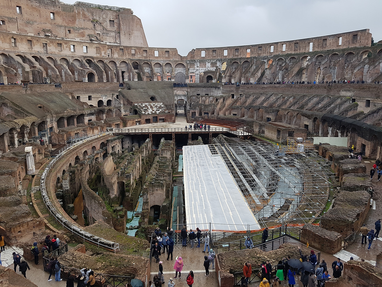 숙소에서 20분 정도 걸어가니 웅장한 콜로세움이 모습을 드러내고 있었다. 우리는 그 앞에 서서 2,000년 전에 지어진 장엄한 유적에 입을 다물지 못했다. 표를 예매해야 해서 줄이 늘어진 매표소에서 기다리는데 먹구름이 잔뜩 낀 날씨에 비가 보슬보슬 내리기 시작했다. 아이를 안고 모자를 쓰고 비를 맞으며 표를 사고 이윽고 입장했다. 로마 패스를 사지 않아 표를 사는 데에는 조금 대기가 있었지만 들어갈 때에는 그래도 금방 들어갈 수 있었다. 콜로세움의 정식 명칭은 플라비우스 원형경기장으로 베스파시우스 황제부터 시작해 아들 티투스 황제가 다스리던 서기 80년에 지어진 경기장이다. 대학 1학년 미술사 시간에 콜로세움은 1층부터 도리아식, 이오니아식, 코린트식의 원주가 층마다 다르게 있어서 미술 건축사적으로 봤을 때 좋은 공부가 된다고 배운 기억이 났다. 흔히 글레디에이터 영화로 많이 대중매체에 알려져 있는데 검투 경기만이 아니라 크리스트교를 박해하는 장소로도 이용되었고 시민들을 위한 오락 시설로 맹수 경기, 서커스 공연 같은 것도 했고 심지어는 경기장에 물을 채워 가상 해전까지 벌였다고 한다. 해전은 비용 문제로 오래 지속되지 못했지만 로마 시민의 인기를 얻기 위한 황제들의 노력을 알 수 있었다. 크리스트교에 대한 박해가 자행되었던 곳이라 희생된 교인들을 추모하는 공간도 있었다. 5만 명 이상을 수용할 수 있는 이 콜로세움은 매우 효율적으로 이어져 입퇴장을 할 때에 붐비지 않고 오갈 수 있는 게이트가 따로 있어 현대 경기장 못지않은 시설을 자랑한다. 햇볕이 뜨거운 날이면 최상층의 나무 기둥으로 가림막을 설치해 마치 지금의 돔구장처럼 모습이 변해 그때 당시로서는 놀라운 지금도 불가사의한 건물이다. 계단을 통해 2층으로 올라가 바라보는 콜로세움 안은 이제 폐허로 변해 있었지만 그래도 그 당시 모습을 상상하기에 충분했다. 이 곳에서 울려 퍼졌을 함성과 탄식, 죽어갔던 사람들에 대해 잠시 생각해보았다. 이 건물 안을 수많은 사람들과 지금 걷고 있는 기분이 신기했다. 과거 수많은 사람들이 웃고, 환호하고 또 누군가는 죽음을 맞이한 곳에서 이렇게 바라보고 있자니 그저 대단한 건축물이 아닌 이제는 한 줌의 흙으로 돌아간 그들이 있었다는 공간으로 나에게 다시 기억되었다.