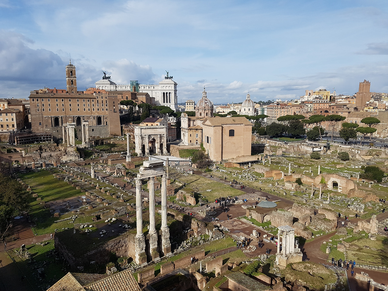 날이 개고 콜로세움을 나와서는 콘스탄티누스 개선문을 지나 바로 옆 포로 로마노로 향했다. 포로 로마노가 한눈에 내려다보이는 팔라티노 언덕에서 그 모습을 찬찬히 바라보았다. 팔라티노 언덕은 로마의 건국 시조인 로물루스, 레무스 형제가 나라를 세운 곳이라 알려져 있다. 이탈리아 독재자였던 무솔리니로 인해 파괴된 적이 있다고 하는데 그래도 이렇게 보존되어 우리의 눈에 담겨 주었다. 흐렸던 날씨에서 구름이 개고 밝은 햇살이 등장해 걷는 내내 화창한 기운을 얻고 반짝이는 유적을 카메라에 담았다. 겨울철이지만 날이 좋아져 따뜻하게 다닐 수 있었다. 그늘이 없어서 여름에는 오후에 절대 다니지 말라고 하는 구역이지만 지금은 겨울이라 오히려 시원함을 느끼며 다닐 수 있었다. 티투스 황제 개선문, 바실리카, 베스타 신전, 원로원, 카이사르가 화장되었던 곳 등 수많은 유적이 즐비한 곳이 포로 로마노라서 이곳에만 서 있어서도 오래전 로마 공화국과 제국의 번성했던 시절에 와 있는 듯한 기분이 들었다. 각 건물을 찾아보고 이름을 확인하면서 이런 폐허 유적은 손바닥을 대면 그때 모습을 들려주는 듯하여 그 옛날의 영화를 반추해보기 좋았다.