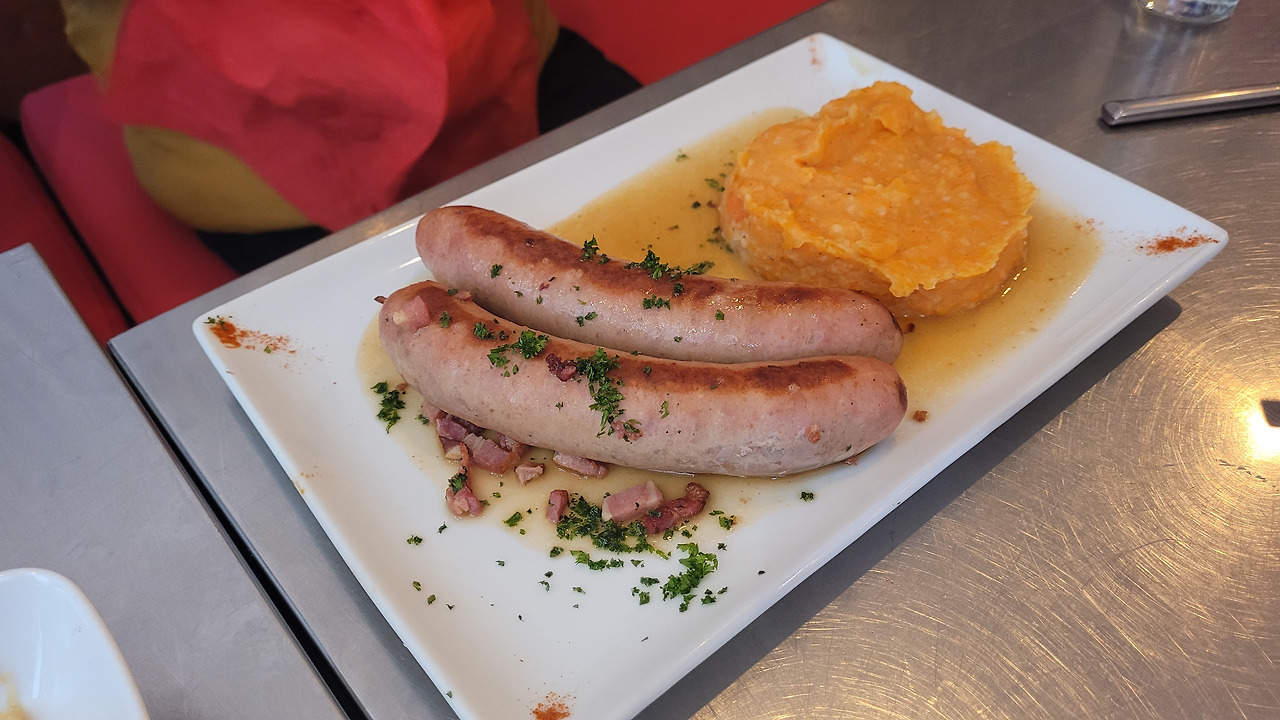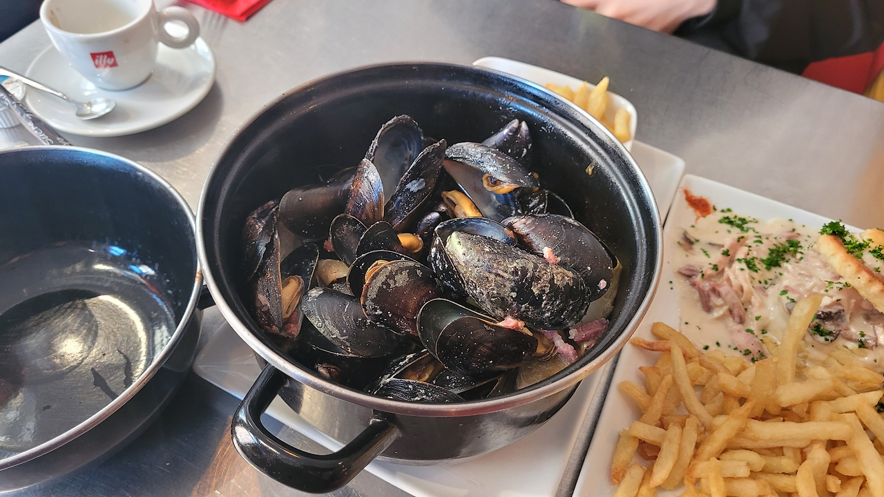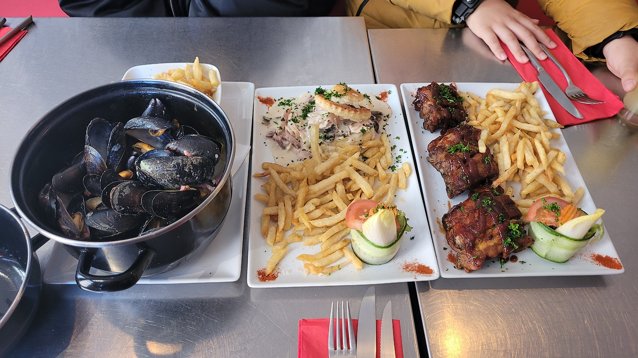 다른 큰 규모의 만화 가게를 갔다가 점심때가 되어 아내가 찾아놓은 벨기에 요리 식당을 찾아갔다. 홍합탕, 등갈비 구이, 크림 버섯 닭가슴살, 콜라 라이트, 카페 오레, 착즙 레몬 주스 등을 주문했다. 요리가 조리되는 시간이 조금 긴지 천천히 나왔다. 다른 테이블도 다 그런 거 보니 조리시간이 있는 듯했다. 음식은 하나같이 입에 맞아서 괜찮았다. 레몬 주스는 착즙 그대로에 물을 타먹는 거여서 아이가 많이 시다고 했다. 옆 테이블에 혼자 식사하는 할아버지가 소시지에 감자와 당근 으깬 것을 드시길래 맛있어 보여서 이것도 추가로 주문해 먹었다. 많이 시켰지만 다 먹어서 만족스러운 식사였다.식당 주인 할머니는 중간에 와서는 식사는 괜찮은지 물어보았다. 서양에서 식사할 때 이렇게 주인이나 웨이터가 요리에 대해서 물어보는 문화가 생소하긴 했으나 좋아 보였다.