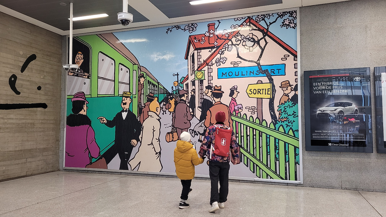 나와서 벨기에 브뤼셀 하면 떠오르는 명소인 오줌 싸는 소년동상을 보러 갔다. 이미 사람들 몇 명이 사진을 찍고 있었는데, 알고는 있었지만 명성에 비해 역시 작디작은 크기에서 헛헛한 웃음이 나왔다. 그래도 여행의 순간이 다 경험이니까 방문 기념으로 볼 가치는 있는 듯했다. 길드 조합에서 나왔는지 전통 복식을 한 사람들이 모여 행사를 하고 있었다. 오줌싸개 동상도 그에 맞게 옷을 입고 있었는데 색다른 풍경이었다. 동상에서 그랑 플라스 가는 거리에는 와플, 초콜릿, 기념품 가게들이 줄지어 있었다. 그리고 미리 검색해 찾아 놓은 땡땡의 그림 벽화가 있어서 소소한 재미를 주었다.