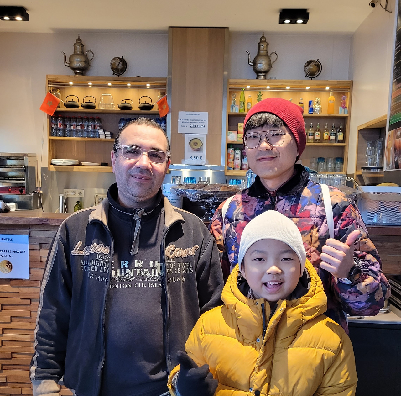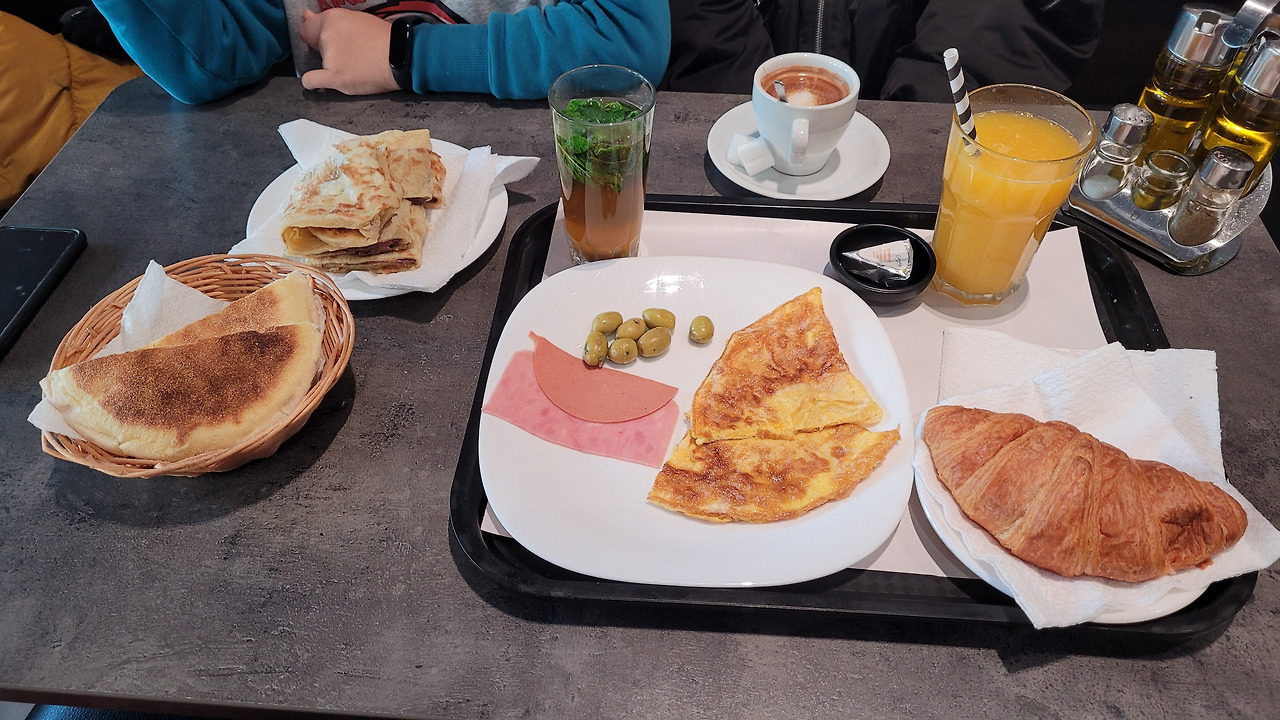 역 로비로 나오니 땡땡 벽화가 있어서 과연 땡땡의 고향 같은 분위기를 가져다주었고 아이도 정말 좋아했다. 같이 사진을 찍고 이른 아침이라 간단하게 식사를 하기 위해 역 근처에 있는 모로코 카페에 갔다. 모로코 아저씨들의 사랑방인 듯 이미 여러 명의 손님들이 담소를 나누고 있었다. 조식 메뉴와 함께 민트 티, 카페 오레 등을 시켰는데 친절한 응대에 감사했다. 특히 민트 티가 너무 맛있어서 민트 티에 대해 사랑에 빠질 정도였다. 식사를 한 후 계산하고 나서 사장님에게 같이 사진 찍고 싶다 해서 사진을 찍었다.
