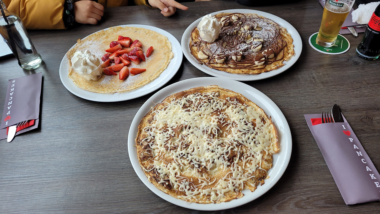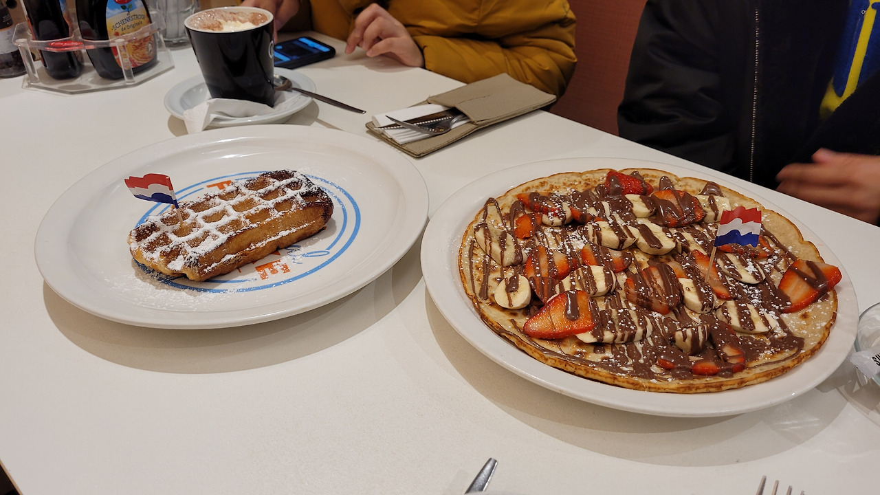 대마초 냄새가 흘러 다니는 큰 거리로 나와서 치즈 판매 가게에서 여러 치즈를 구경하고 시식을 해봤는데 7개월 숙성한 치즈는 맛있었지만 우리에게 익숙한 맛이었고, 36개월 숙성한 치즈는 쿰쿰하면서 고소하고 퍼석한 맛이었는데 감칠맛이 있어서 계속 생각났다. 아이는 종류별로 한 번씩 다 먹어보면서 맛을 즐겼다. 근처 쇼핑몰을 우연히 들어갔는데 옷이 너무 저렴해서 나와 아내는 옷을 보다가 아이 옷만 몇 벌 샀다. 걷다 보니 다리가 쉬어가는 게 필요해 보여 또 다른 팬케이크 카페에 가서 커다란 팬케이크와 와플을 주문해서 먹었다. 팬케이크는 한 번이나 먹을까 했는데 벌써 암스테르담에서만 3번을 먹게 되었다. 아이는 이것 때문에 암스테르담에서 살고 싶다고 했다.