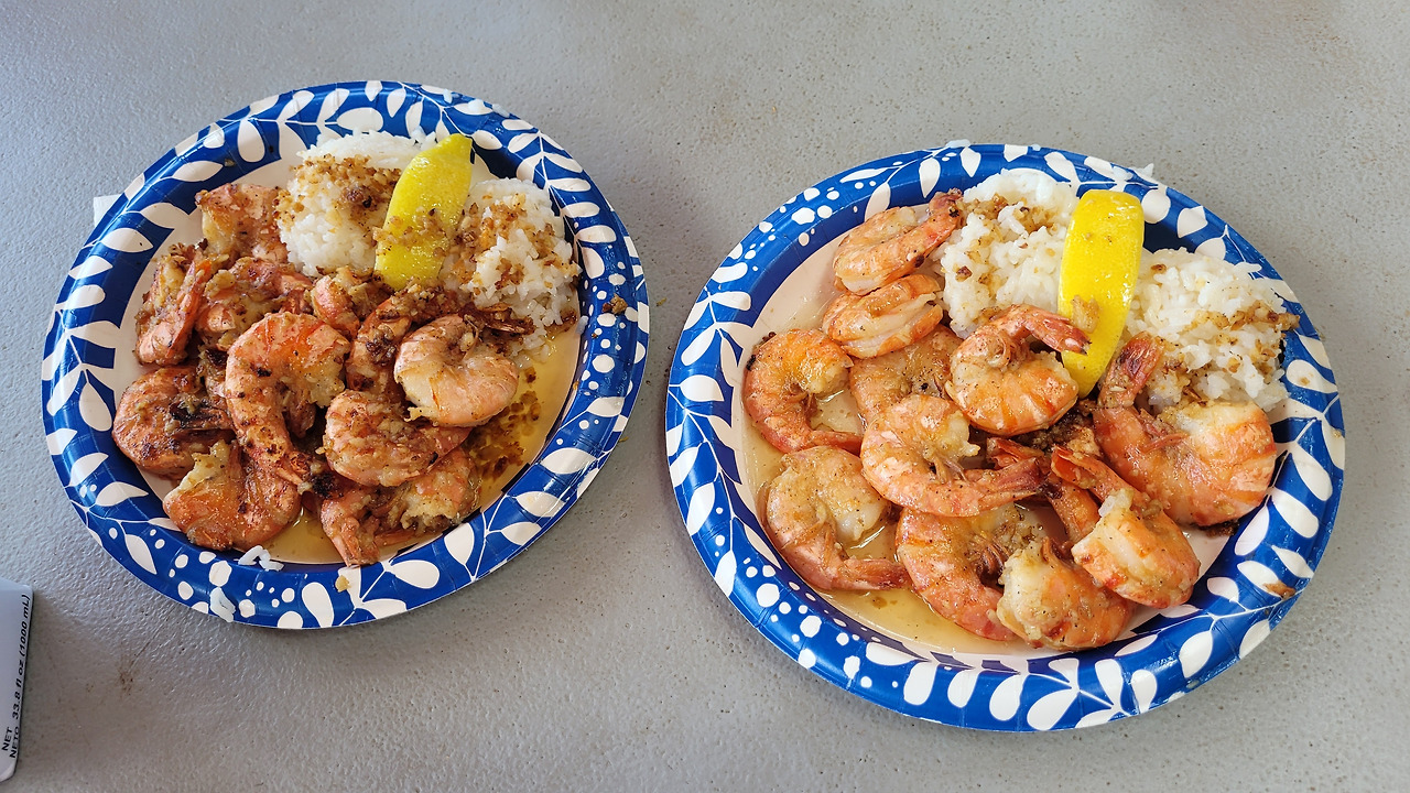 서퍼들의 성지, 노스 쇼어(North Shore)로 올라가는 길은 해안 도로가 아닌 내륙을 통과해서 가는 길이라 여러 마을을 지나쳐서 유명한 지오반니 새우 트럭(Giovanni's Shrimp Truck)을 만날 수 있었다. 노스 쇼어에 위치한 지오반니 새우는 훌리훌리 치킨, 마츠모토 셰이브 아이스와 함께 여기 와서 먹자고 한 음식이었다. 새우 트럭이 있는 주차장에는 주차가 안되어 근처 교회 주차장에 5달러를 내고 주차했다. 새우 트럭에도 여러 사람들이 줄 서서 기다리고 있었다. 우리는 갈릭 새우 2개를 주문했다. 아이가 팁 상자에 지폐 1장을 넣고 잠시 기다리니 우리 번호를 불렀다. 아내가 받아온 접시에는 마늘 기름으로 튀겨진 새우와 밥이 먹음직스럽게 보였다. 상태가 안 좋은 나였지만 배가 고파서 몇 개 집어먹었다. 통통한 새우에 짭짤하면서 쌉싸름한 마늘 후레이크 간이 잘 배어있어서 입맛을 당기게 했다.