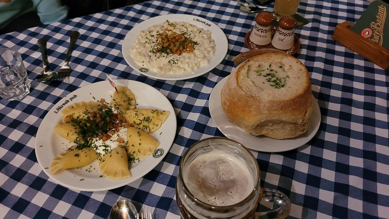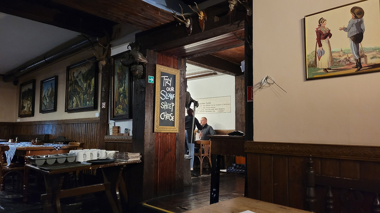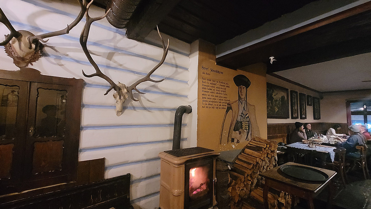 저녁 식사는 미리 찾아놓은 슬로바키아 식당으로 갔다. 삐꺽거리는 마룻바닥 소리가 정겹게 느껴지는 인테리어에 한쪽 벽면에 쓰인 스름트 야노시코바(Jánošík's Death)는 슬로바키아의 시인 야네스 보토가 1862년에 쓴 서사시로서 이 작품은 슬로바키아의 민중 영웅인 야노시코의 삶과 죽음을 다루고 있었다. 야노시코는 18세기 후반에 슬로바키아의 트렌친 지방에서 태어난 실존 인물로 부패한 지주들과 헝가리 귀족들의 착취에 맞서 싸우는 산적대의 두목이었다. 야노시코는 백성들의 사랑을 받았지만, 결국 체포되어 처형당했던 인물로 우리의 임꺽정과 닮아있었다. 이것만 봐도 진짜 슬로바키아 식당에 온 듯해서 기대가 되었다.
