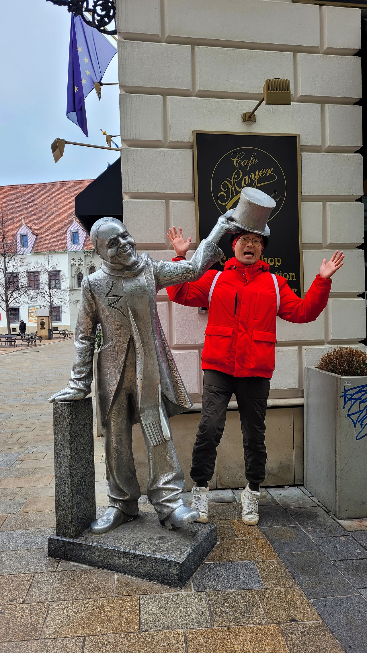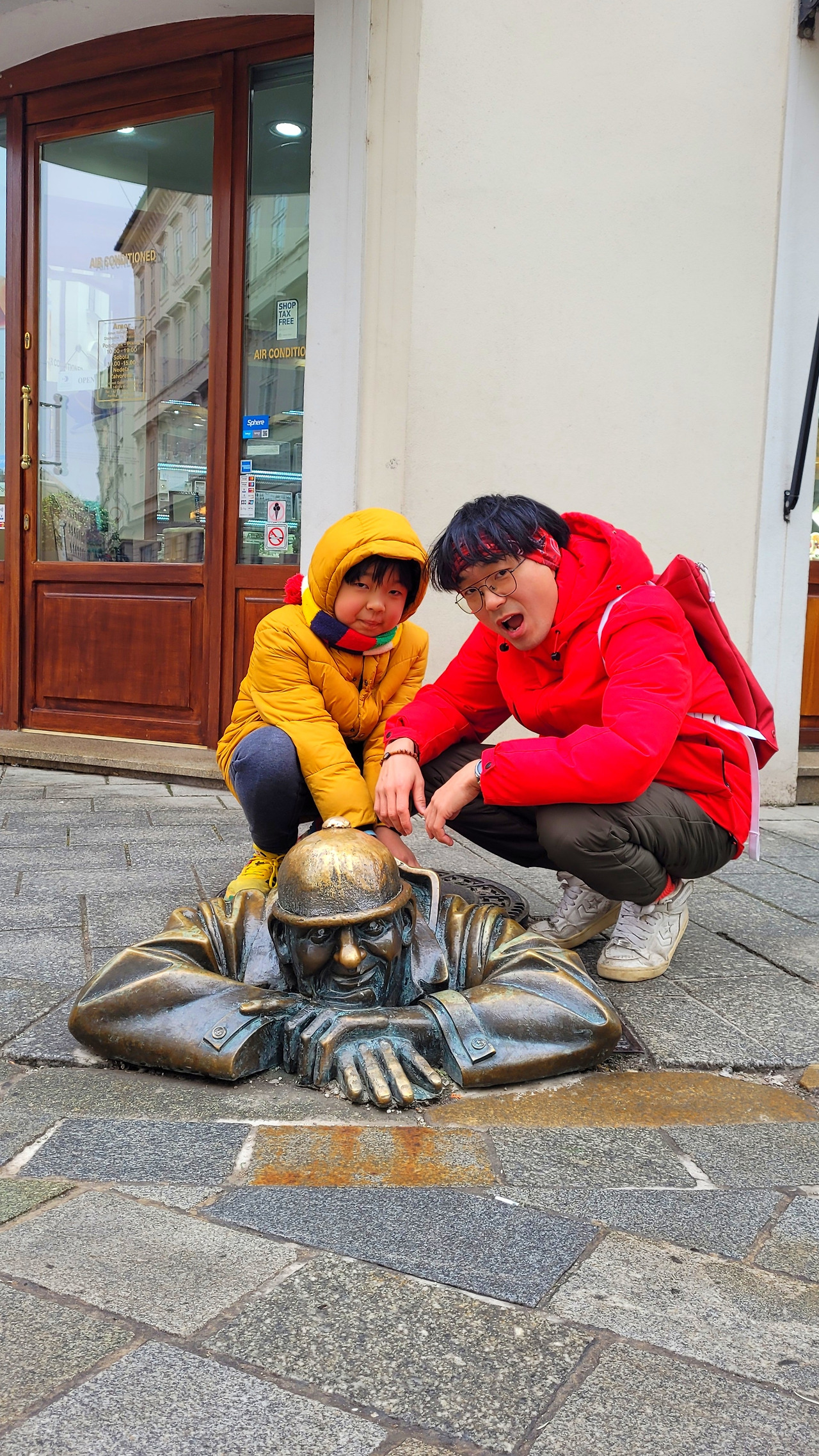 한참 성에서 브라티슬라바 시가지를 바라보고 터벅터벅 내려왔다. 열심히 성까지 올라오고 내려간 아이를 위해 시내로 와서 젤라토를 사주겠다고 약속했는데 그 가게가 영업을 하지 않았다. 이후 네 곳을 더 찾아갔으나 다 영업을 안 해서 하늘이 무너질 듯한 상황이라 아이 표정이 좋지 않았다. 하지만 어쩔 수 없는 일이었다. 막시밀리아노바 폰타나 광장에 이색적인 동상이 많아서 사진을 찍으며 작은 재미를 찾았다. 먼저 맨홀 아저씨 동상(Čumil)은 1997년 슬로바키아 조각가 빅토르 훌리크가 제작했으며, 맨홀 입구에 몸을 걸치고 쉬면서 행인들을 바라보고 있는 하수도 작업 노동자의 이색적인 청동상으로 눈길을 끌었다. 추밀은 일하는 사람이라는 뜻이었다. 뭔가 의미 있는 것 같은데 별다른 의미가 없는 동상이라고 하니 보는 사람들의 시선이 곧 의미 같았다.