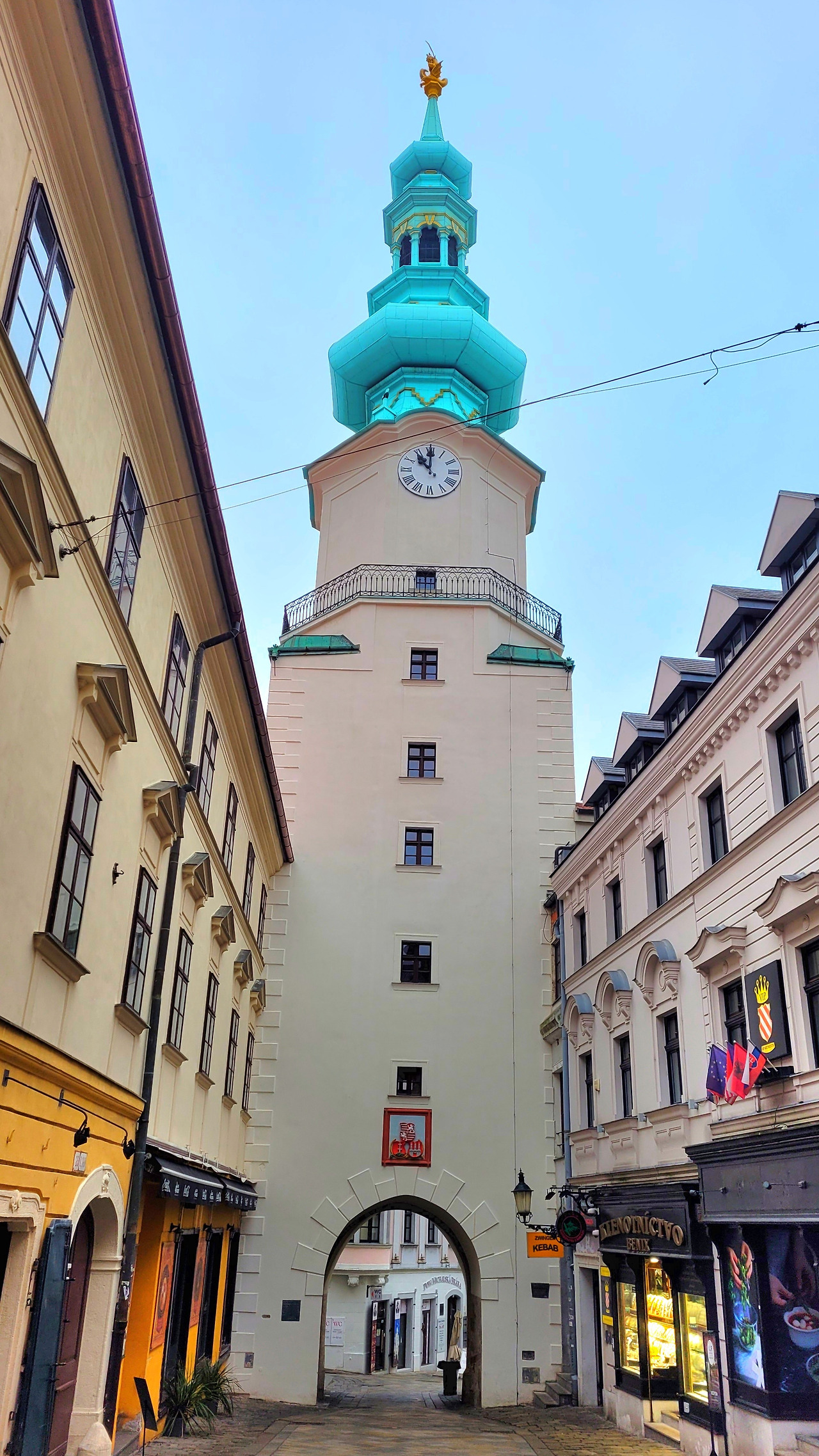 트램이 다니는 큰 도로를 건너니 이정표 같은 미하엘 문이 우리를 맞이했다. 미하엘 문(Michalská brána)은 중세 요새의 유일하게 남아 있는 도시 문으로, 1300년경에 지어졌다. 현재의 모습은 1758년 바로크 양식으로 재건된 것이었다. 6층 높이의 석조 탑으로, 높이는 51m이며 탑의 꼭대기에는 성 미카엘이 용을 밟고 서 있는 조각상이 있다. 성 미카엘이 있는 이유는 악마를 물리치는 천사로, 브라티슬라바의 수호성인이기 때문이었다. 미하엘 문을 지나서 소박하고 정갈한 느낌이 편안한 헝가리의 성 스테판 성당에서 잠시 기도드리고 나왔다.