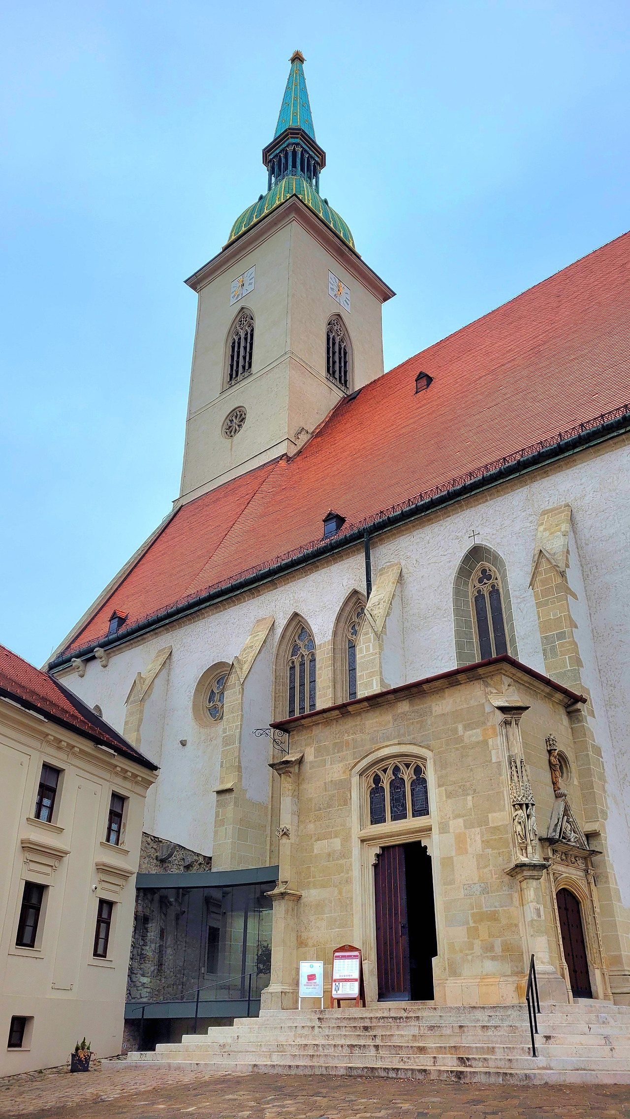 그다음 간 성 마르틴 대성당(Dóm sv. Martina)은 13세기 고딕과 로마네스크 양식의 성당으로서 1245년에 지어졌으며, 1563년부터 1830년까지는 헝가리 왕국의 왕관을 보관하는 곳으로 사용되었다. 이곳이 오스트리아 영토였을 때는 대관식이 열렸던 유서 깊은 곳이었다. 우리가 들어갔을 때는 미사 중이어서 제단까지 갈 수는 없었고 안에서 살펴보는 정도에 그쳤다. 성에 올라가기 전 잠시 쉬기 위해서 성당 옆에 있는 카페에 가서 라테 마키아토, 도피오, 핫 초콜릿과 체리 조각 케이크를 주문해서 여유를 즐겼다. 슬로바키아 할머니들 모임이 있는지 꽤 왁자지껄했지만 그 분위기도 재미있었다.