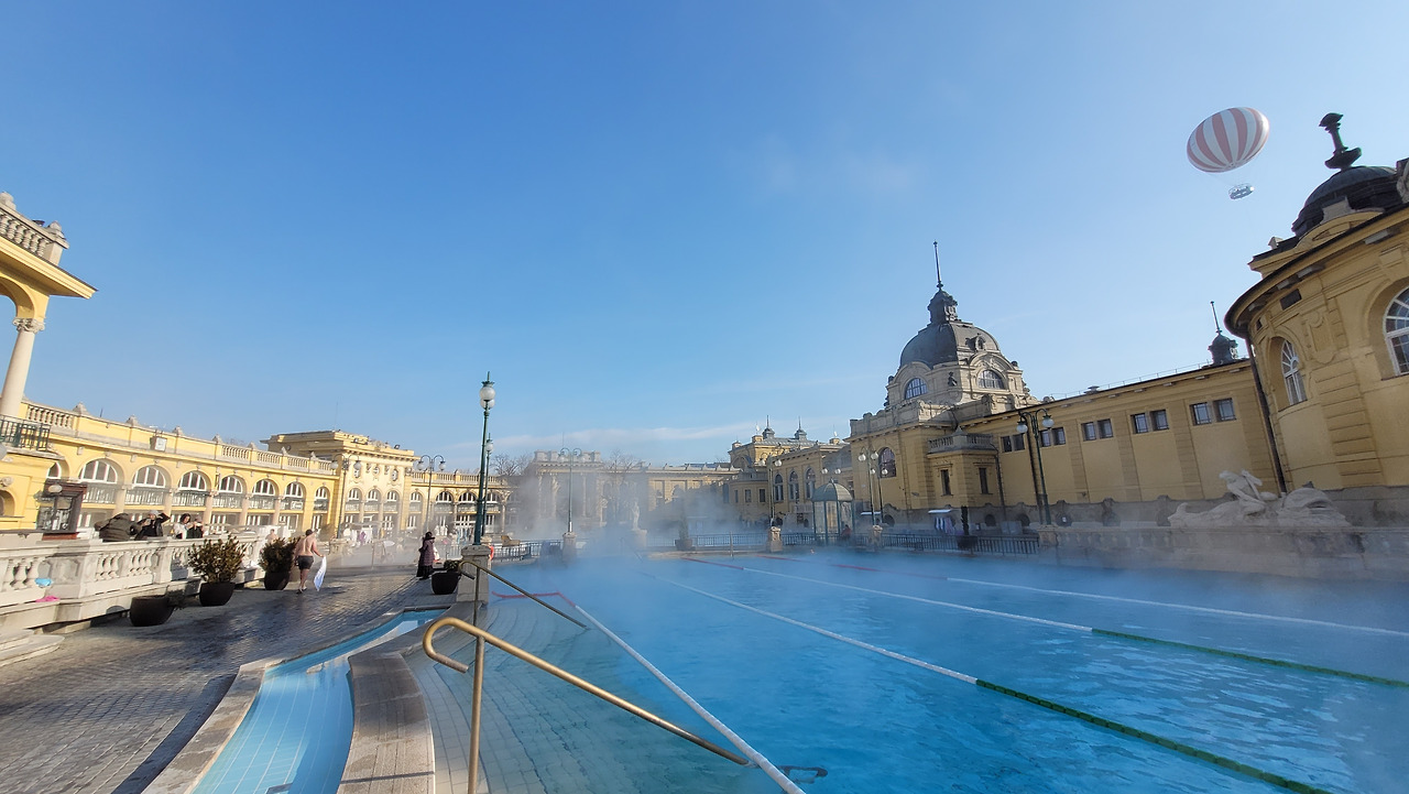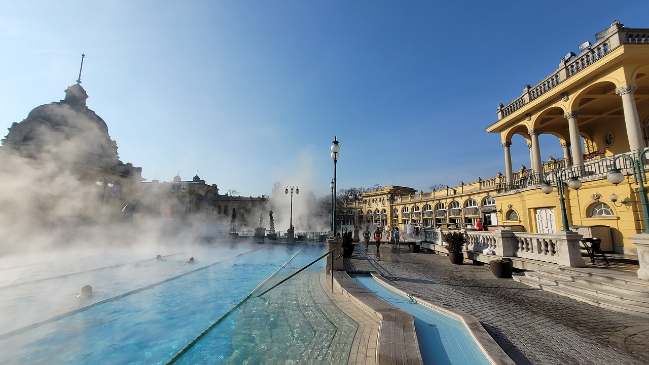 영하의 날씨 속에서 온천이라니 기대가 되었다. 세체니 온천(Széchenyi Gyógyfürdő és Uszoda)은 유럽 최대 규모의 온천이면서 온천으로 유명한 헝가리 온천의 대명사와 같은 곳이었다. 1913년 완공되었으며, 건축가 죄죄 치글러가 설계한 네오르네상스 양식과 네오바로크 양식이 혼합된 화려한 외관으로 유명했다. 온천은 총 18개의 온천탕과 사우나, 수영장 등으로 이루어져 있는데, 온천수는 74°C와 77°C의 2개의 샘에서 공급되며, 황산염, 칼슘, 마그네슘, 중탄산염, 불소 등이 함유되어 있다. 그래서 관절염, 신경통, 피부 질환 등에 효능이 있는 것으로 알려져 있고 옛날에는 치료 목적으로 많이 찾았다고 했다.